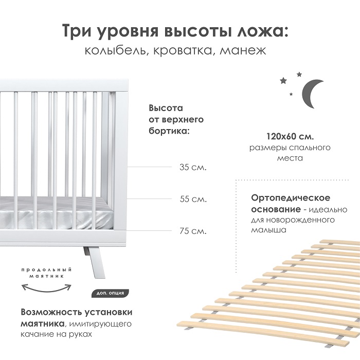 имеет 3 уровня ложа. Верхний - для первых месяцев жизни ребенка: вам не придётся низко наклоняться, чтобы положить малыша в кроватку. Средний - для ребенка, уже умеющего сидеть. Нижний обезопасит подросшего ребёнка, который уже умеет стоять, от выпадения из кроватки.