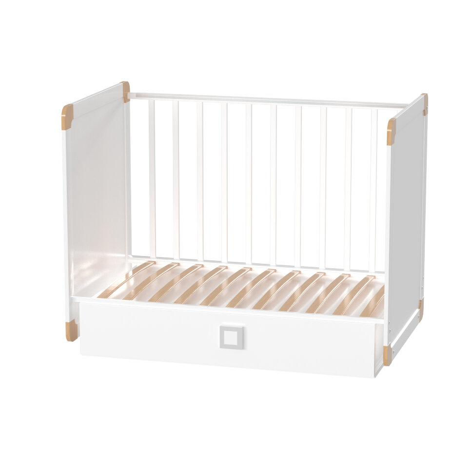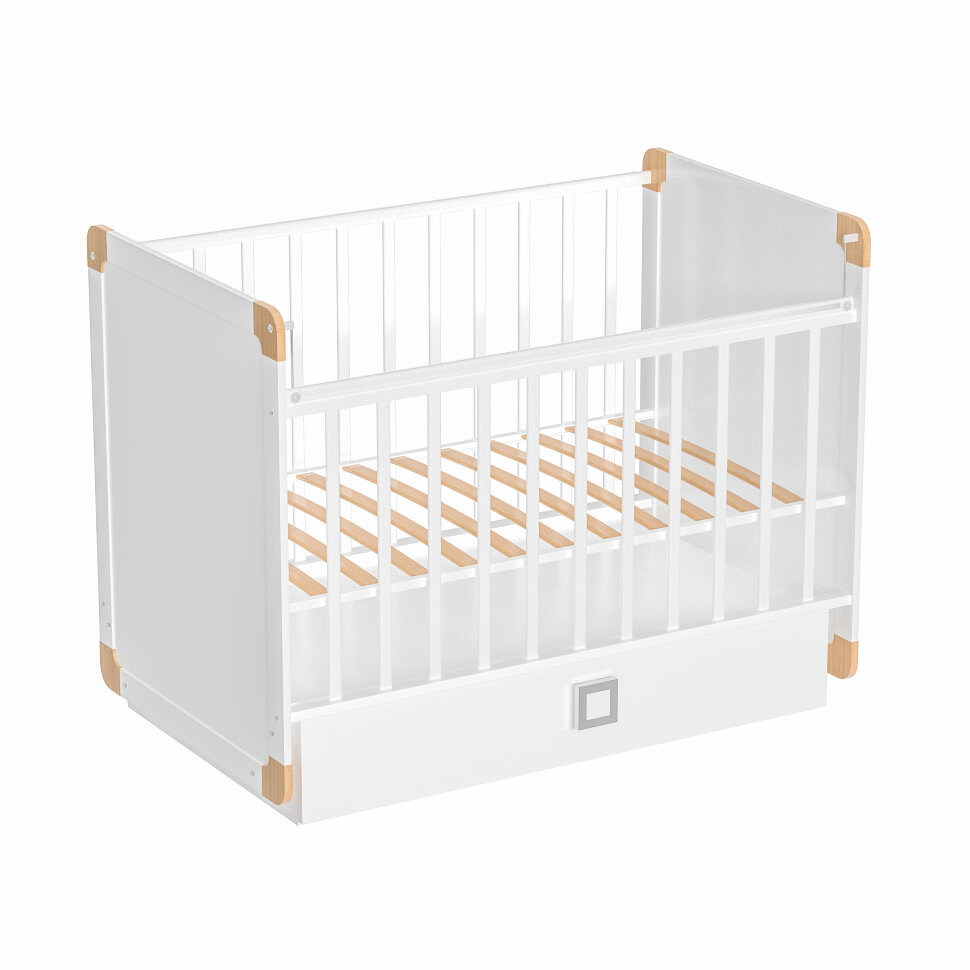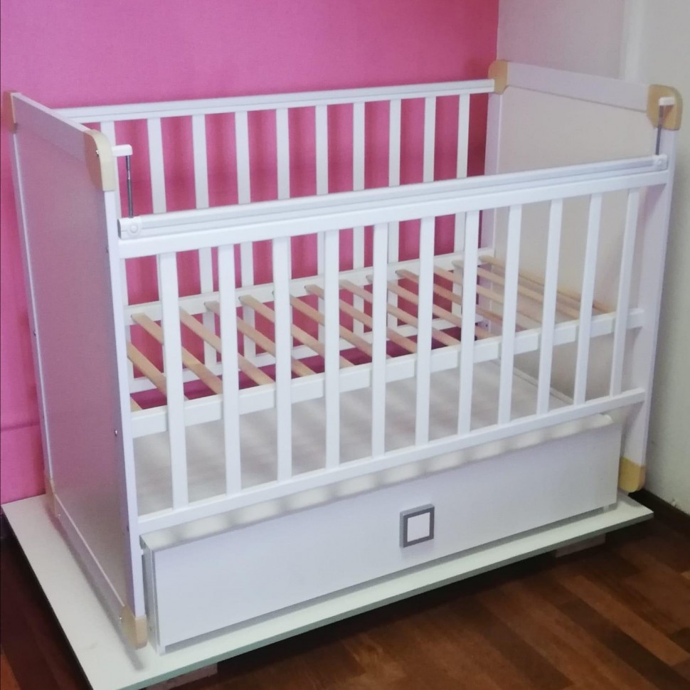 Кроватка не имеет острых углов. Покрыта безопасными красками на водной основе, которые разрешены при производстве детской мебели. Дно кроватки реечное и регулируется по высоте для удобства родителей. Передний бортик может опускаться или сниматься полностью, превращая кроватку в диванчик.