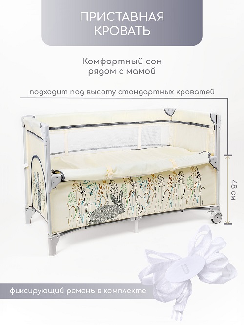 Съемный бортик для использования кроватки как приставной. Фиксирующие ремни в комплекте.