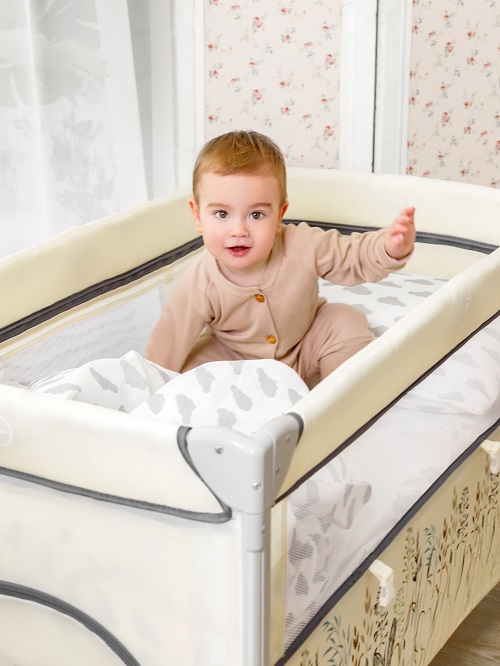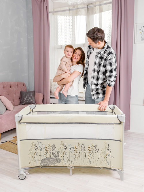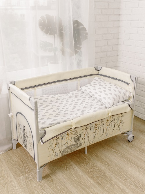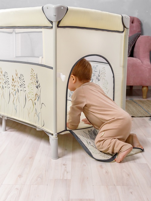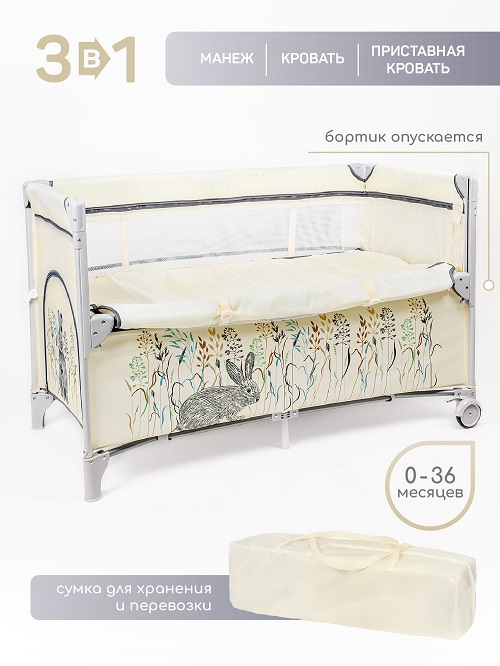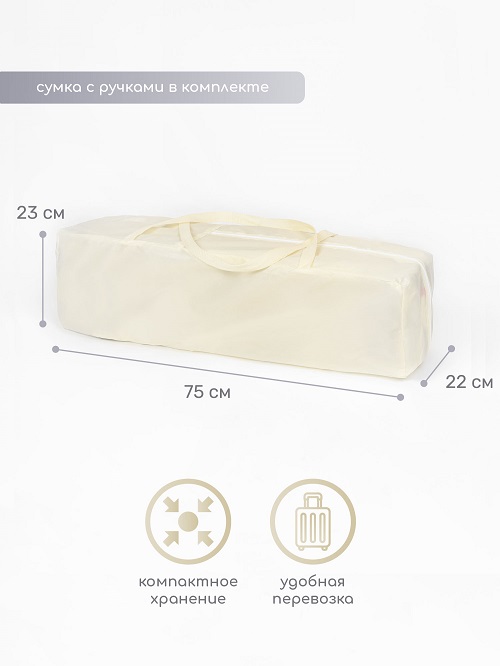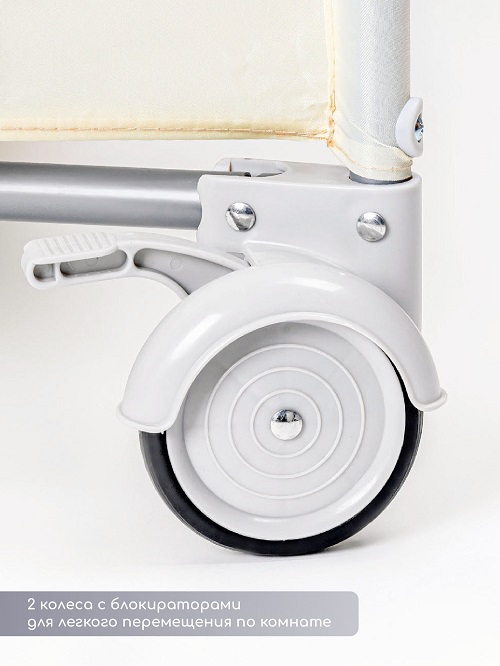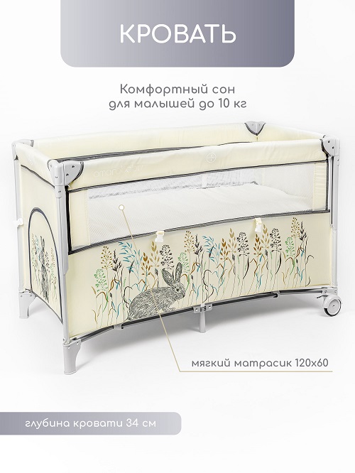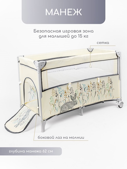 Манеж-кровать состоит из двух уровней по высоте: верхний - для ребенка с рождения до 10 кг, нижний уровень для ребенка до 15 кг. Манеж надежен и устойчив. Для мобильности кроватки предусмотрены 2 колеса со стопорами. При необходимости такую кроватку легко сложить и взять в поездку, для этого предусмотрена специальная транспортировочная сумка-чехол. Чтобы подросший ребенок смог самостоятельно залазить в кроватку предусмотрен лаз на молнии. Один бортик легкосъемный, что позволит на ночь придвинуть манеж к взрослой кровати и быть рядом с малышом.