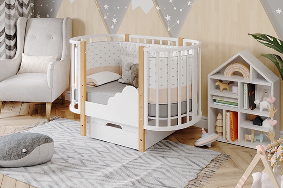 Кровать МЛК Элен 125х70 см с ящиком и маятником - красивая кровать с элегантным дизайном и необычным функционалом. Кроватка имеет регулируемую высоту ложа, что позволит маме удобно укладывать ребенка. Когда ребенок достигнет примерно 1,5-2 лет, кроватку можно трансформировать в диванчик, убрав передний бортик и заменив его специальным ограждением в виде облачка.