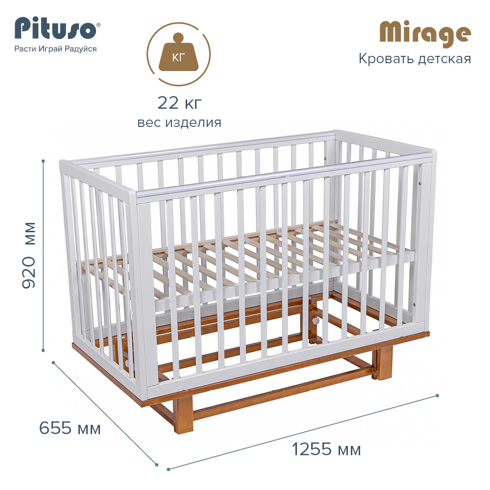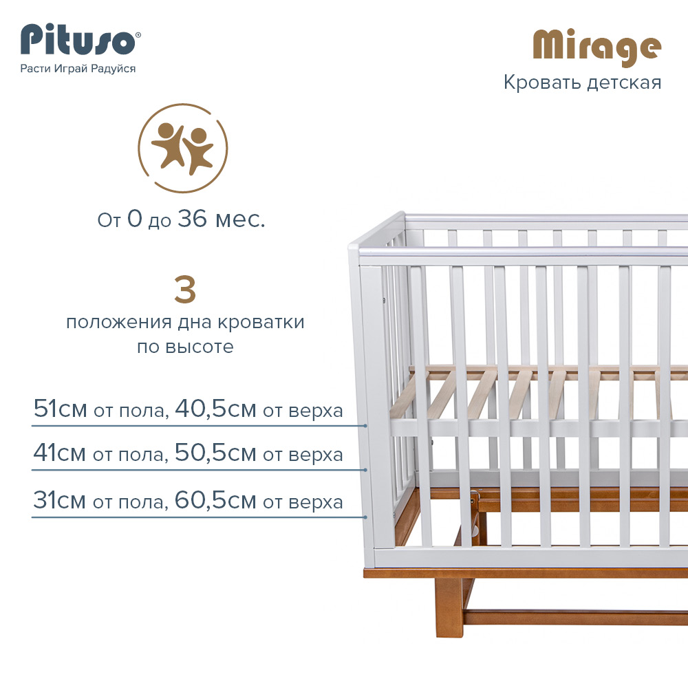 Кровать PITUSO Mirage (Питусо мираж) - красивая, элегантная кровать для ребенка с рождения до 4 лет. Кроватка имеет практичный функционал и очень удобные регулировки. Кровать выполнена из натуральных пород дерева, гарантируя качество и надежность модели. Кроватка имеет регулируемое по высоте спальное ложе 120х60 см. Бортики оснащены силиконовыми накладками, защищающие ребенка во время прорезывания зубов. Когда малыш подрастет передний бортик можно снять, превратив кровать в диванчик. Оптимальное расстояние между узкими рейками гарантирует, что ручки и ножки крохи не застрянут, а скругленные верхние края кроватки защитят от ударов во время сна, отдыха и игр.