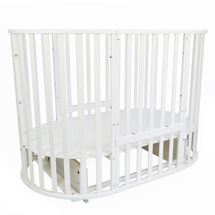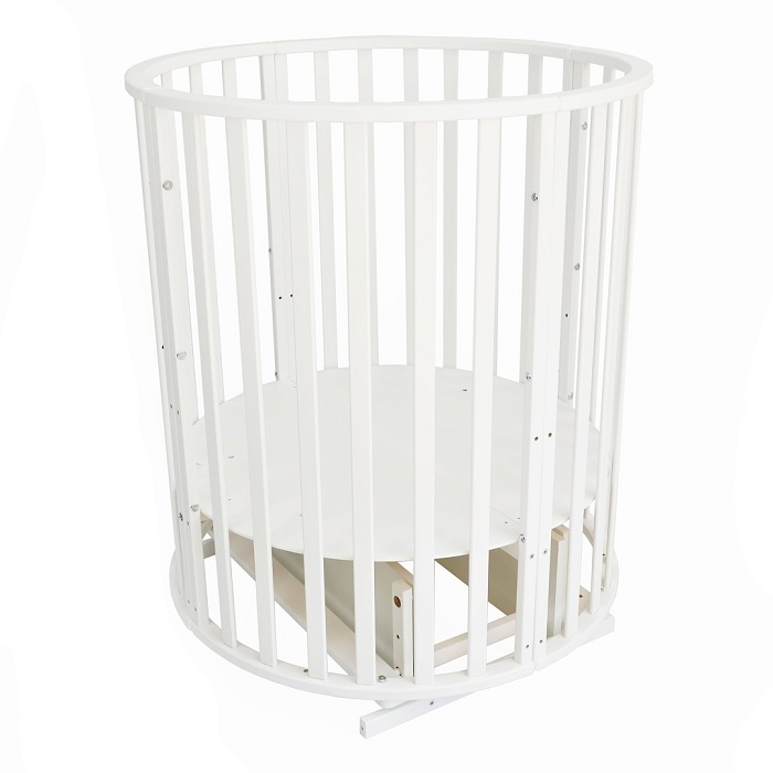 Кровать в зависимости от возраста ребенка может быть собрана в виде круглой колыбельки на колесах или с маятником. Такая "колыбелька" идеально подойдет для новорожденного ребенка. Небольшие размеры кроватки помогут ребенку чувствовать себя более спокойно и комфортно и не боятся большого пространства. Вместе с круглой кроваткой можно собрать пеленальный столик с одной полочкой.
