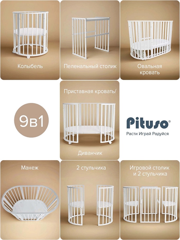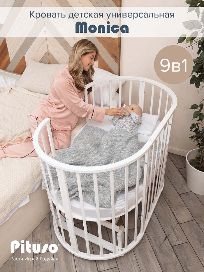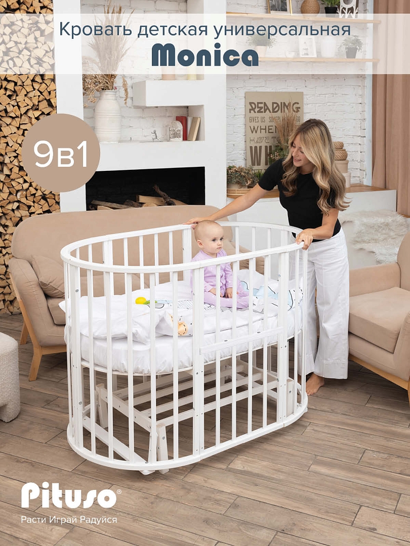 Детская кровать PITUSO MONICA 9 в 1 (Питусо Моника) - детская кровать трансформер для ребенка с рождения до 3 лет. Кровать выполнена из фанеры березы и МДФ, что гарантирует качество и безопасность изделия. Закругленные края деталей не позволят Вашему малышу удариться.