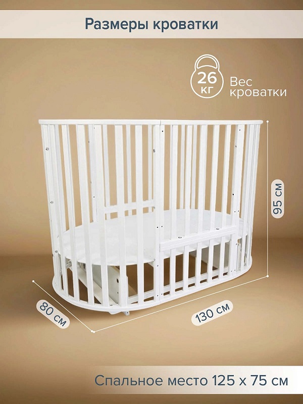 - Размер в собранном виде овальной кроватки: 130*80*95 см.