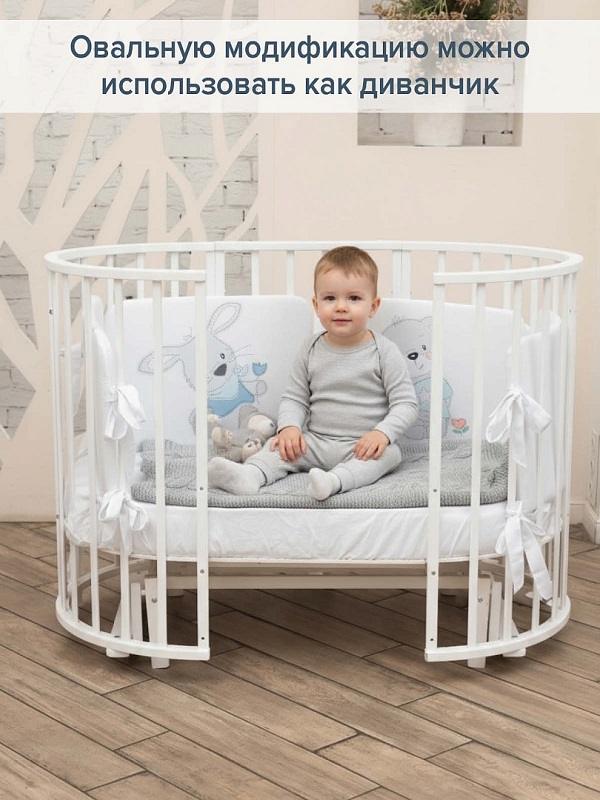 Для ребенка от 4-6 месяцев колыбелька + столик собираются в большую овальную кровать. Она так же может быть установлена на колеса или на маятник. В этом модели уже предусмотрено большое спальное место 120х60 см. Когда ребенок подрастет передний бортик можно полностью снять и превратить кроватку в диванчик. При этом закругленные боковины кровати дадут ребенку безопасность во время ночного сна.