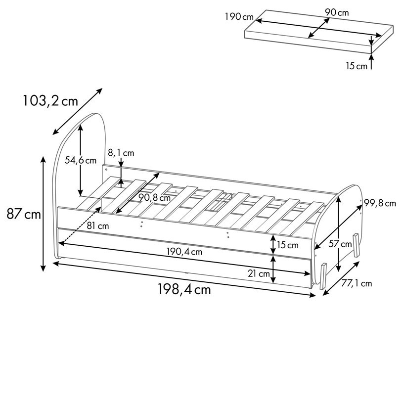 - Кровать:(ВхШхГ) 870 х 1984 х 1032 мм.