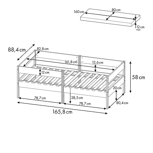 - Габариты кровати (ДхШхВ) – 165,8х88,4х58 см.