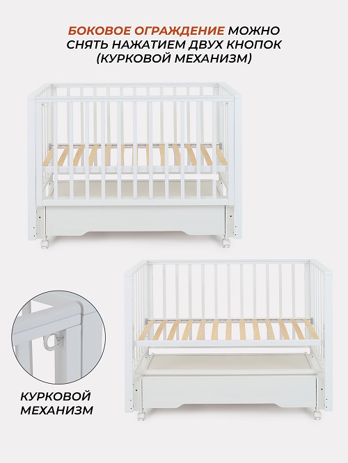 Универсальный маятниковый механизм поможет заснуть даже беспокойному малышу. Маятник мягкий и бесшумный и ни как не потревожит сон ребенка. Съемную боковую стенку удобно опускать нажатием двух кнопок (курковой механизм). Также ее вовсе можно снять и, например, придвинуть к кровати родителей, чтобы обеспечить спокойный сон маме и малышу. Когда кроха вырастет, боковая стенка снимается - кровать превращается в уютный диванчик.