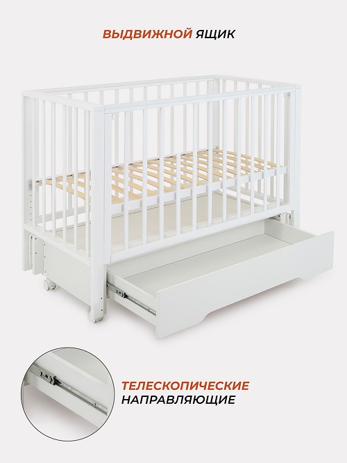 Под кроваткой размещен вместительный ящик для вещей ребенка. Ящик закрытый и надежно закроет вещи от пыли.