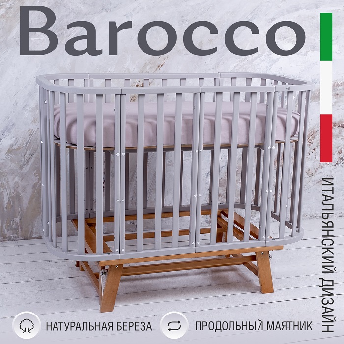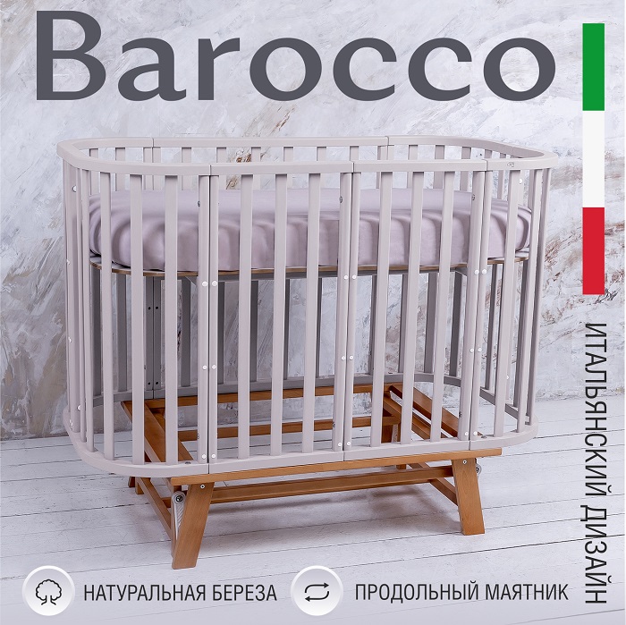 Детская кровать Sweet Baby Barocco New (Свит беби барокко) - это классическая деревянная кровать в современном европейском стиле. Изготовлена из древесины березы, прочного и долговечного материала. В качестве покрытия использовались исключительно качественные, безопасные материалы: краски на водной основе, лаки и итальянская эмаль. Итальянский бренд Sweet Baby позаботился о комфортном сне вашего малыша благодаря плавному механизму качания продольного маятника. Кроватка оснащена специальными фиксаторами, которые приводят маятник в состояние покоя. Стенки и дно кроватки - реечные, что создает естественную вентиляцию матраса и спального места и способствует отведению влаги. Благодаря такой конструкции кроватки малыш всегда в поле зрения мамы.
