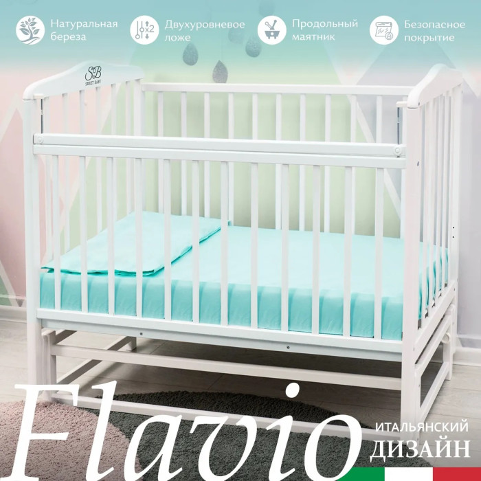 Кровать Sweet Baby Flavio (Свит беби Флавио) - элегантная кроватка в классических расцветках для ребенка с рождения до 3 лет. Кроватка сочетает в себе все необходимые функции для комфорта и безопасности ребенка и его родителей. Модель выполнена из древесины березы и отличается надежностью, долговечностью и экологичностью. Продольный маятник имитирует покачивание как в "коляске" вперед-назад, что поможет укачать и настроить ребенка на сон. За счет компактных габаритов кровати кроватка не занимает много места и отлично подойдет для небольшой комнаты.