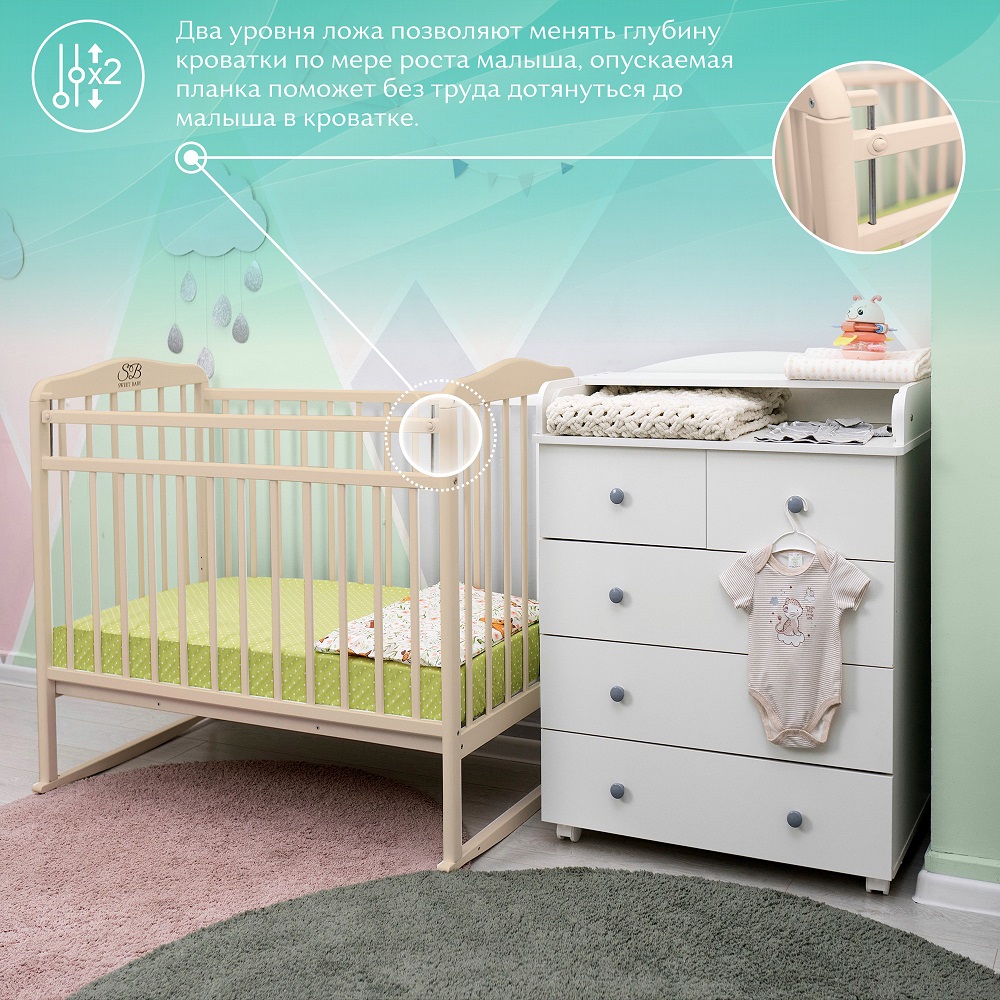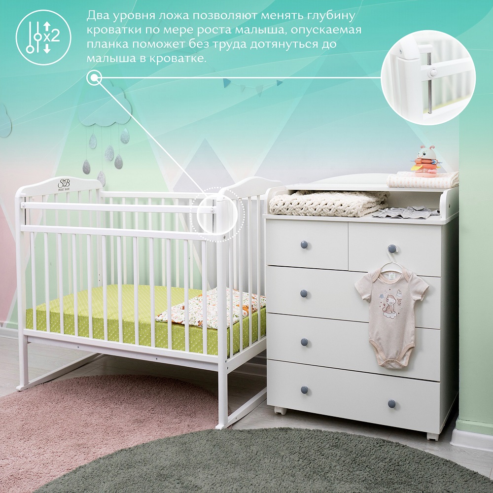 - Два уровня ложа позволяют менять глубину кроватки по мере роста малыша, опускаемая планка поможет без труда дотянуться до малыша в кроватке.