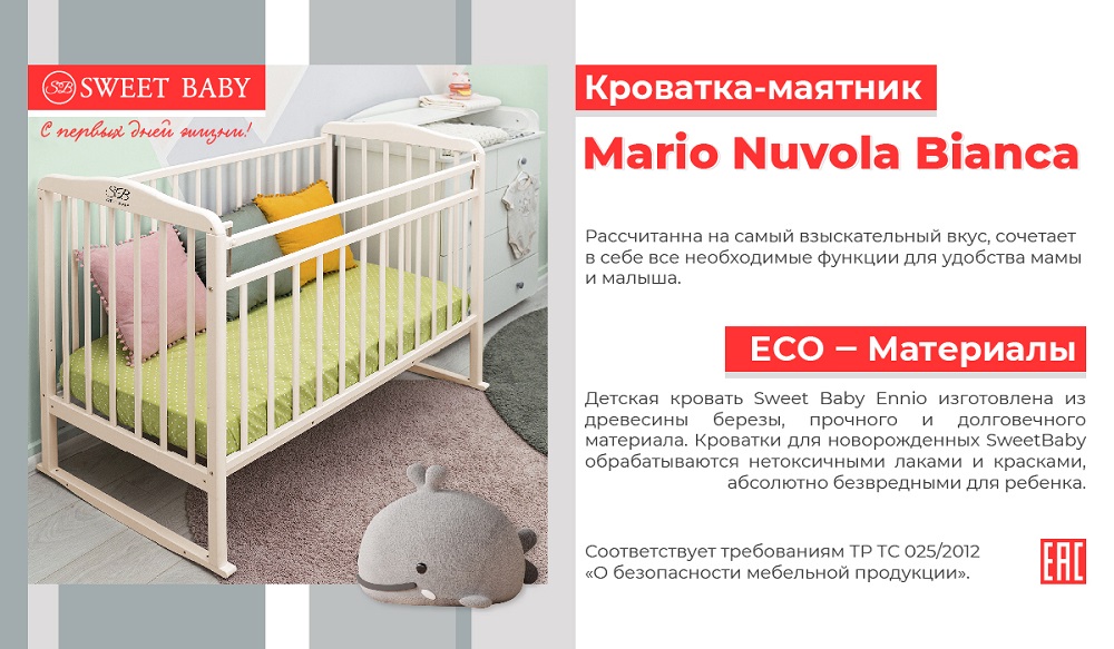 - Детская кровать Sweet Baby Mario выполнена из натуральной берёзы и сочетает в себе классический дизайн и функциональность. Кроватки для новорожденных Sweet Baby обрабатываются нетоксичными лаками и красками, абсолютно безвредными для ребенка.