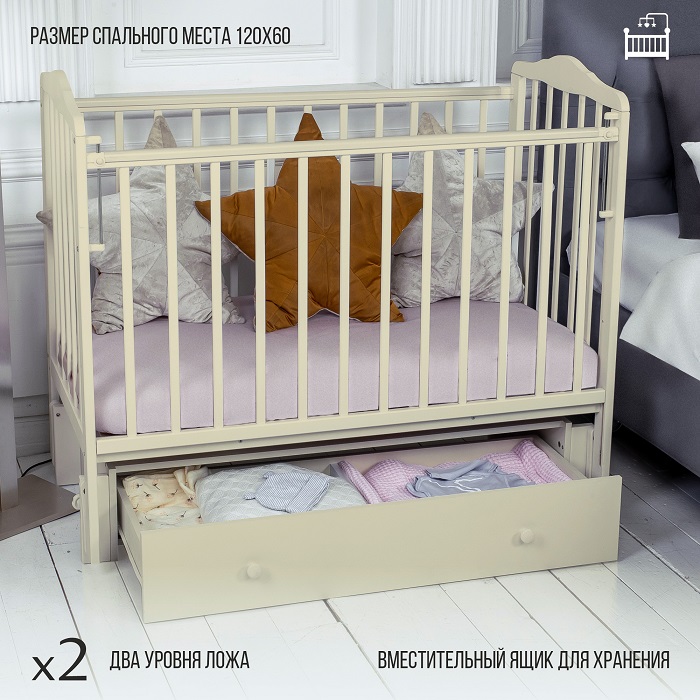 Так же несомненным плюсом кроватки является вместительный ящик закрытого типа. Он позволит удобно хранить детские вещи для сна непосредственно рядом с кроваткой. В такой ящик легко поместятся бортики, одеялко, подушечка.
