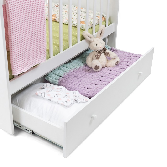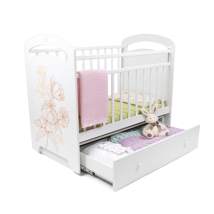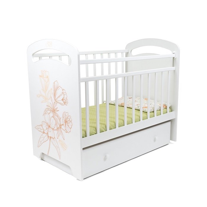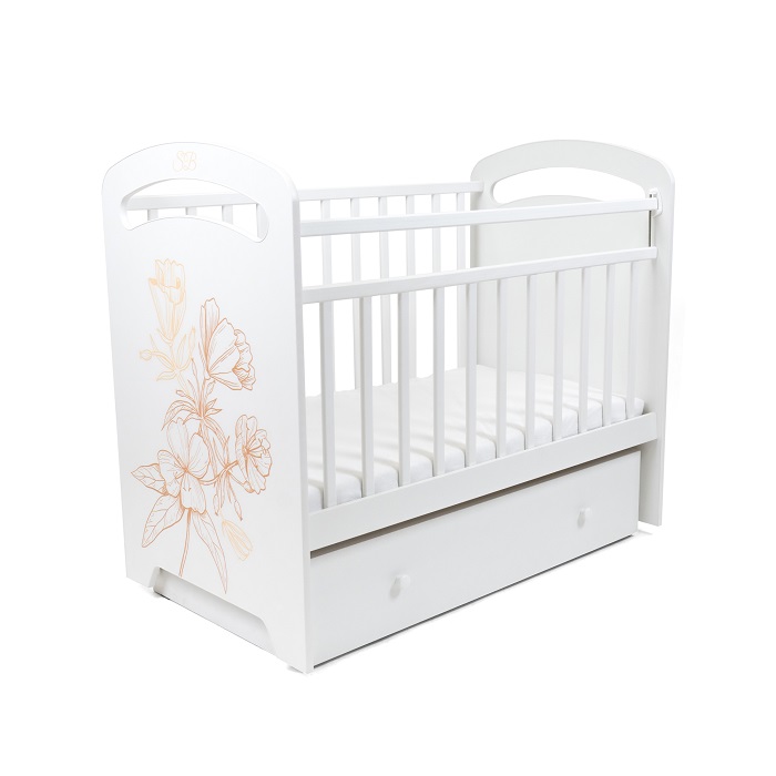Кровать Sweet Baby Rosa (Свит беби роза) - функциональная и очень красивая кроватка с цветочным принтом. Нежный принт украсит любую комнату, сделает ее светлее и нежнее. Кровать изготовлена из экологически чистых материалов, что гарантирует безопасность, надежность и долговечность модели. Покрыта кроватка нетоксичными полиуретановыми красками и лаками на водной основе. Кровать имеет спальное место 120х60 см с регулируемой высотой спального ложа. Передняя спинка регулируется по высоте для удобного доступа к ребенку. Под кроваткой расположен большой вместительный ящик для вещей ребенка.