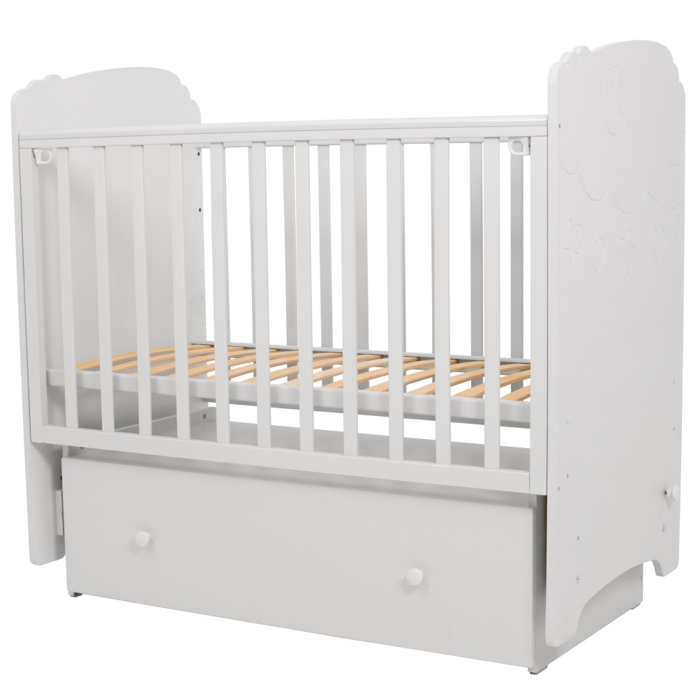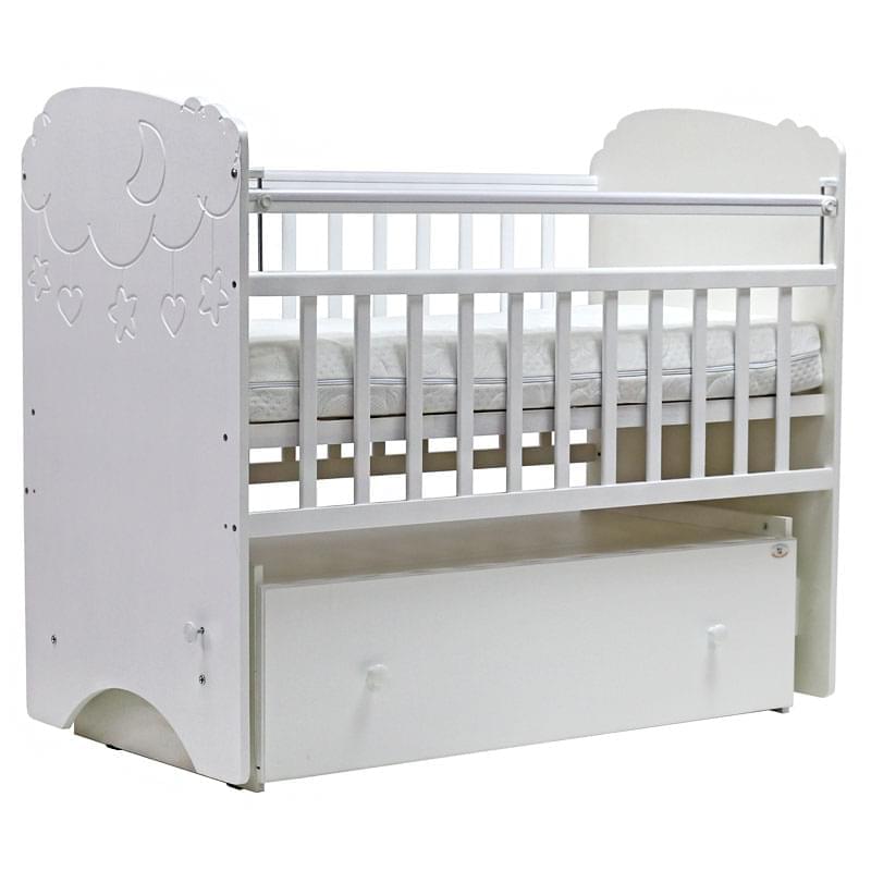 - кроватка удивительно красива благодаря гравировке на боковинах в виде облака с ниспадающими игрушками (сердечками, звездочками)