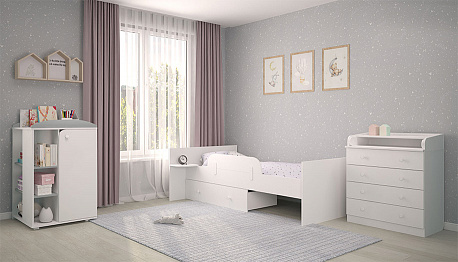 Трансформер включает в себя сразу несколько предметов мебели: пеленальный комод, детская кроватка, подростковая кровать.