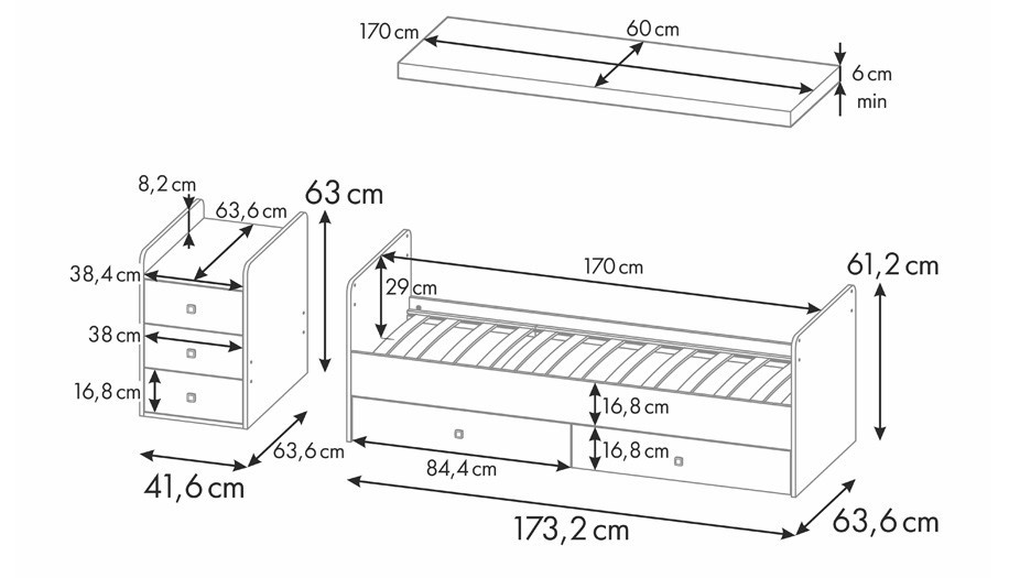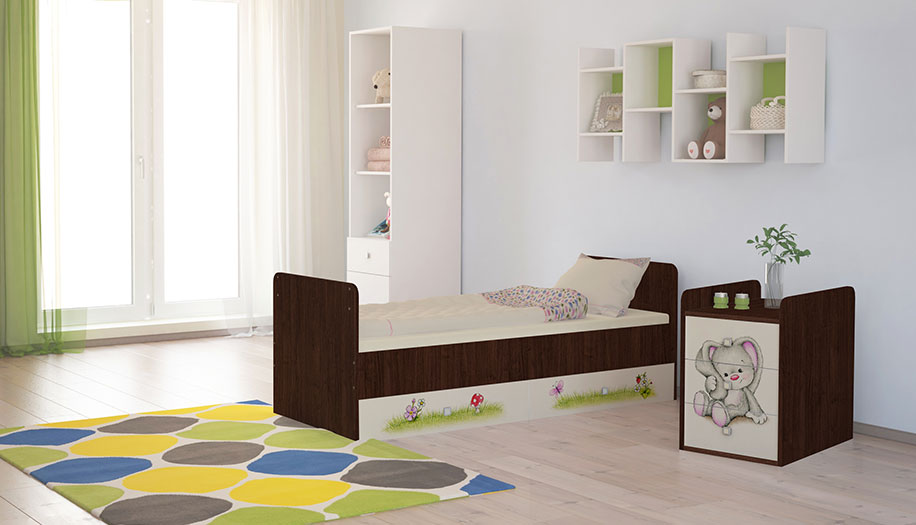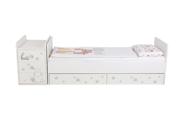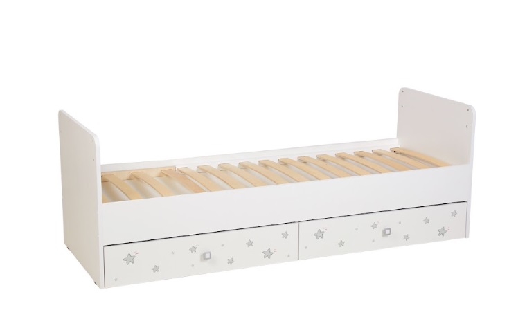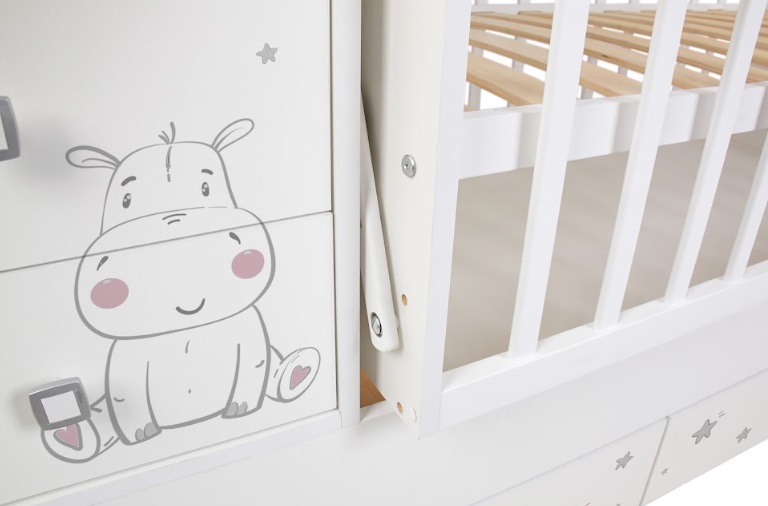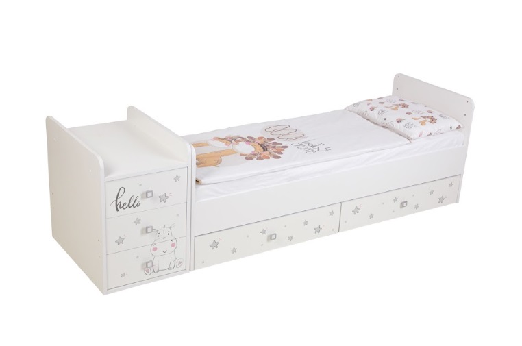 - Трансформируется в подростковую кровать, размер ложа которого 60 х 170 см., и независимую приставную тумбу.