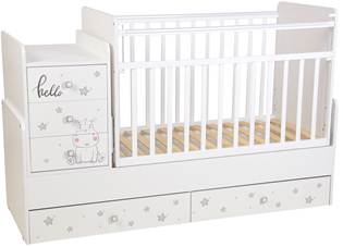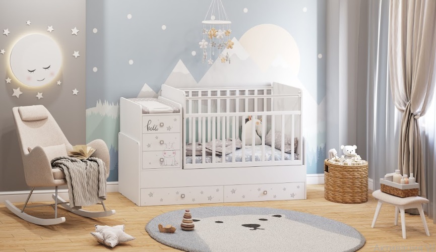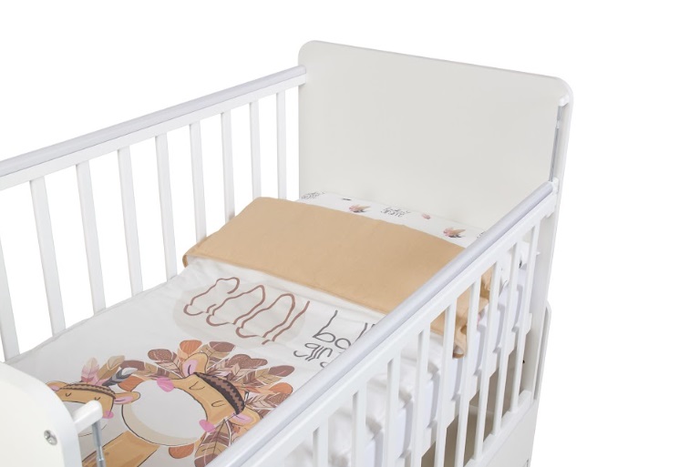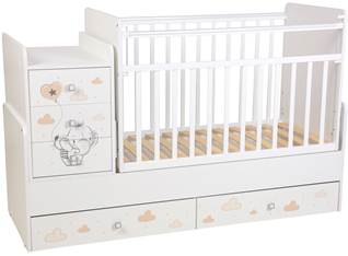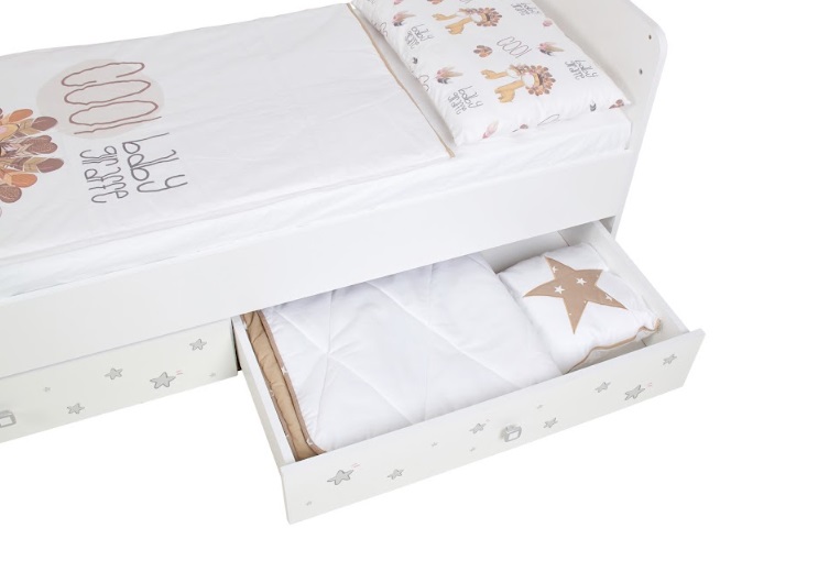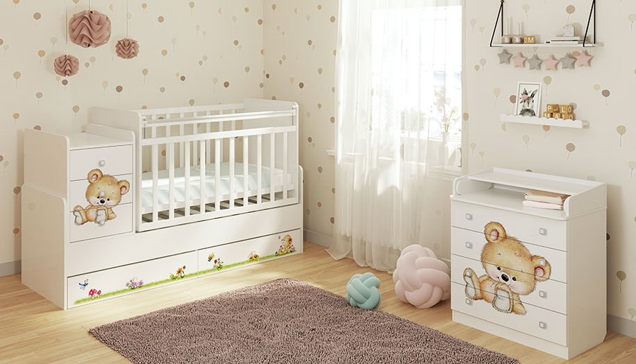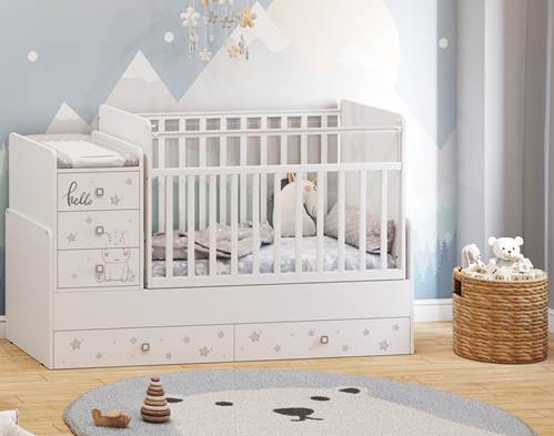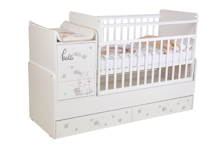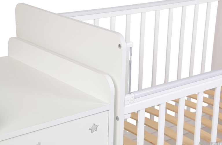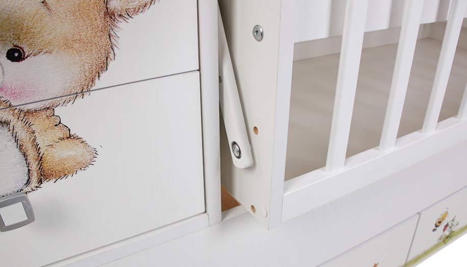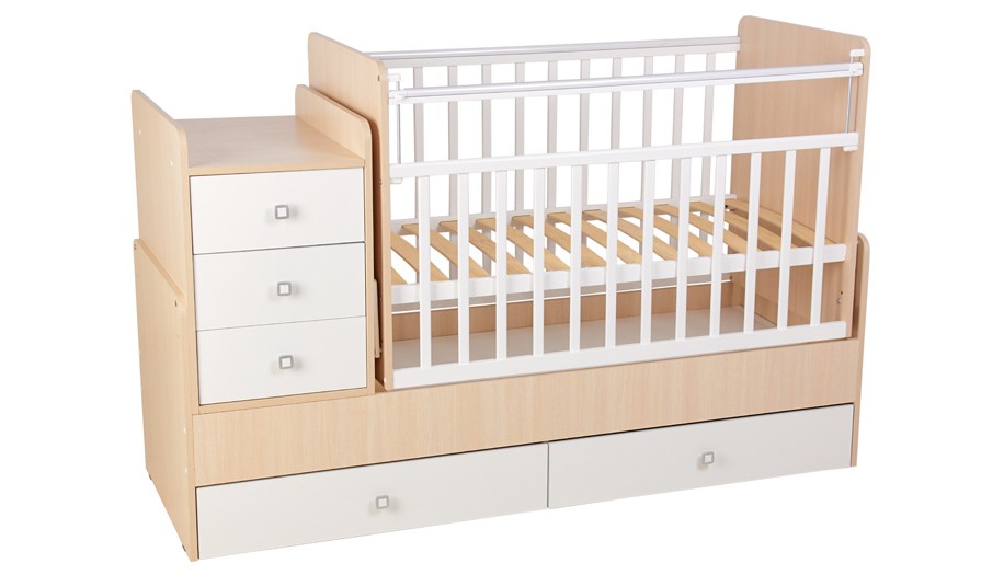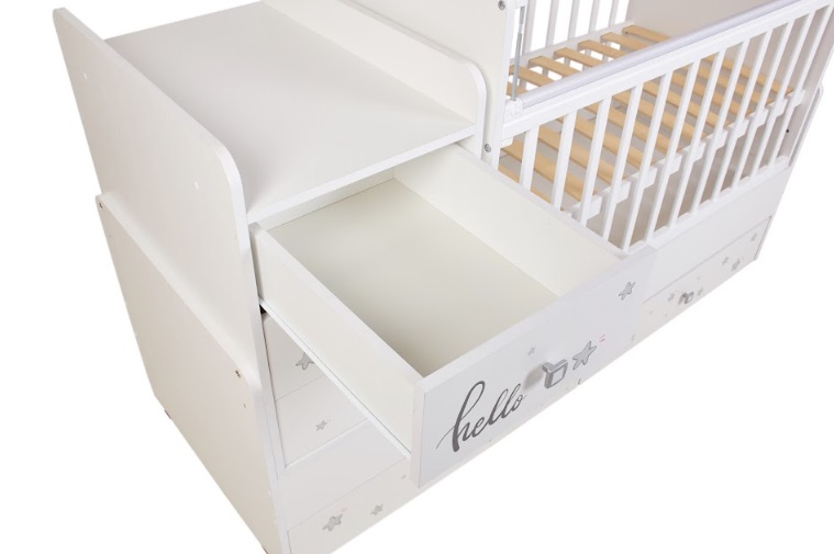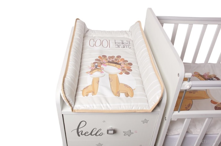 - Комод кроватки имеет пеленальную поверхность с закругленными бортиками по бокам. В комод входят 3 ящика.
