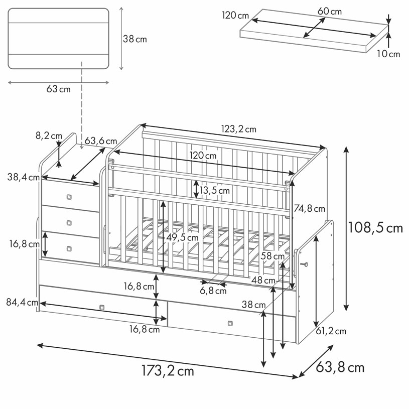- Размеры кроватки (ВхШхГ) – 108,5 х 173,2 х 63,6 см