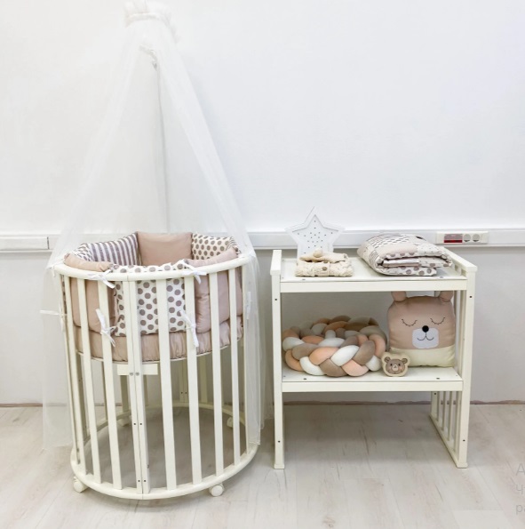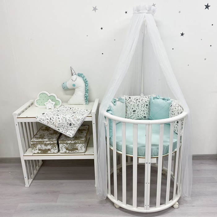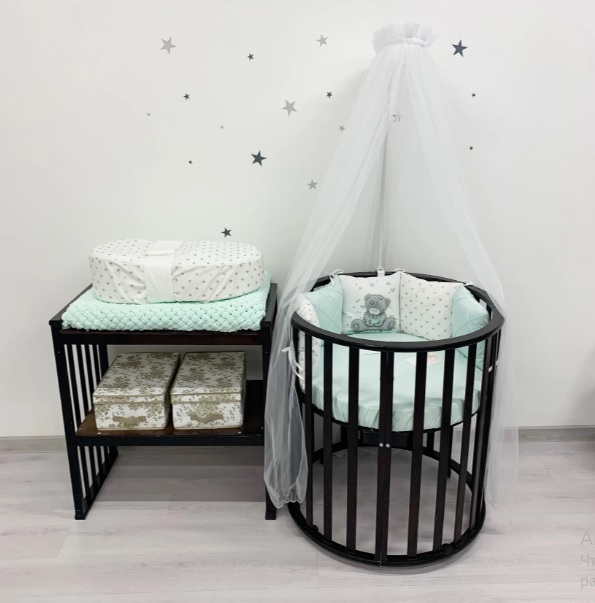 Для новорожденного ребенка предусмотрена красивая круглая колыбелька с удобным пеленальным столиком. В первые месяцы после рождения ребенка у вас будет удобная пеленальная поверхность для переодевания ребенка и удобные полочки для необходимых для малыша вещей. В дальнейшем колыбелька с пеленальным столиком превращаются в овальную кровать, а потом в парту с двумя стульями.