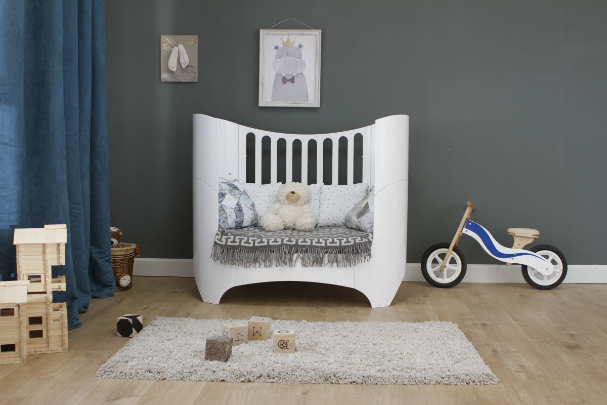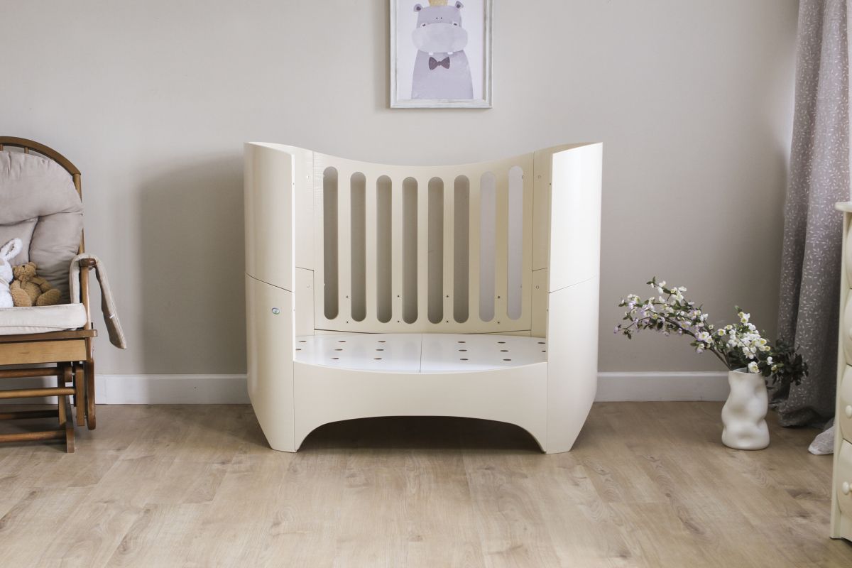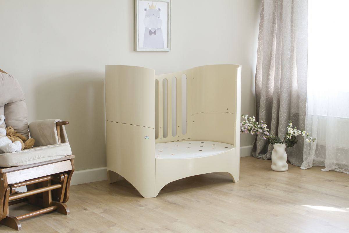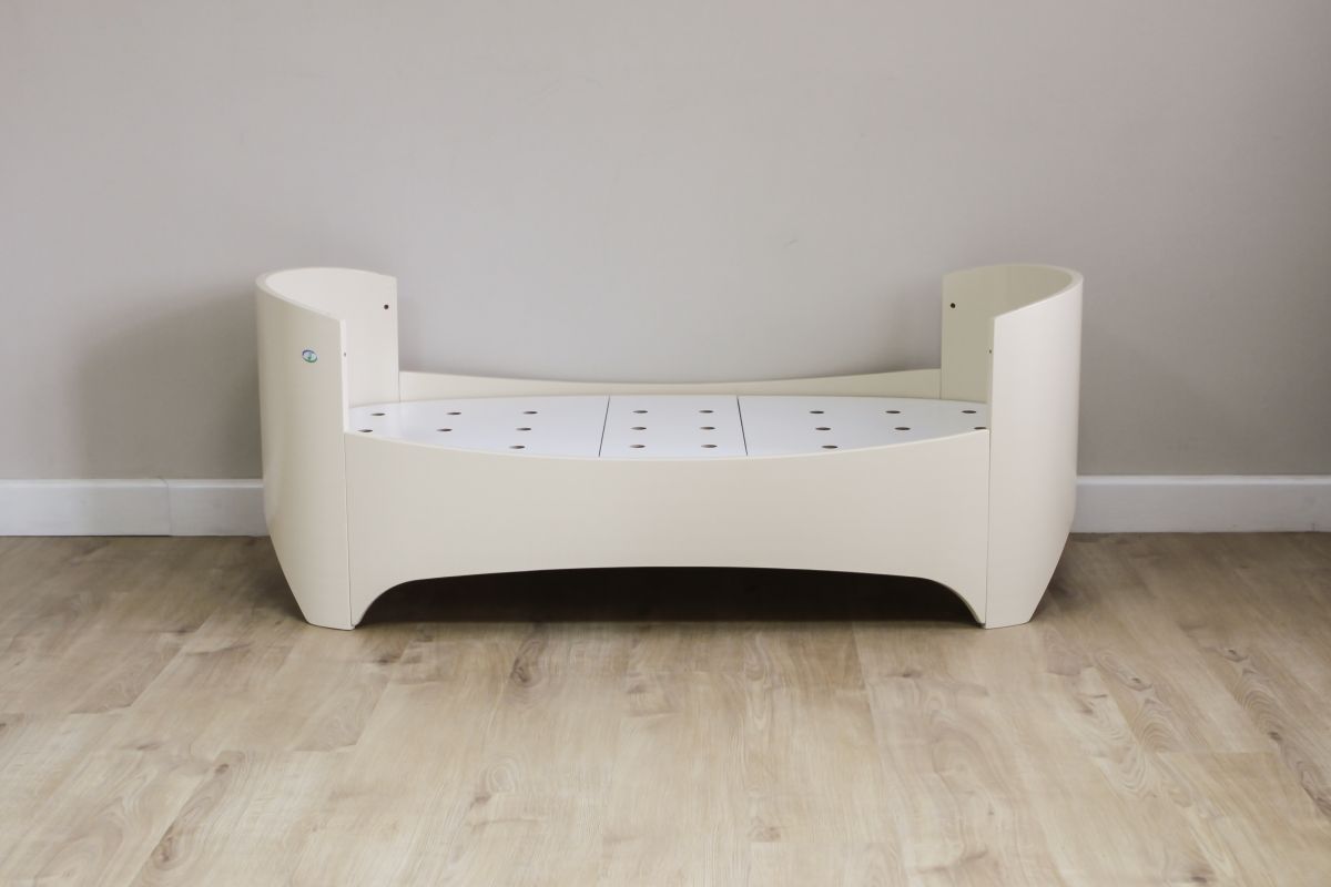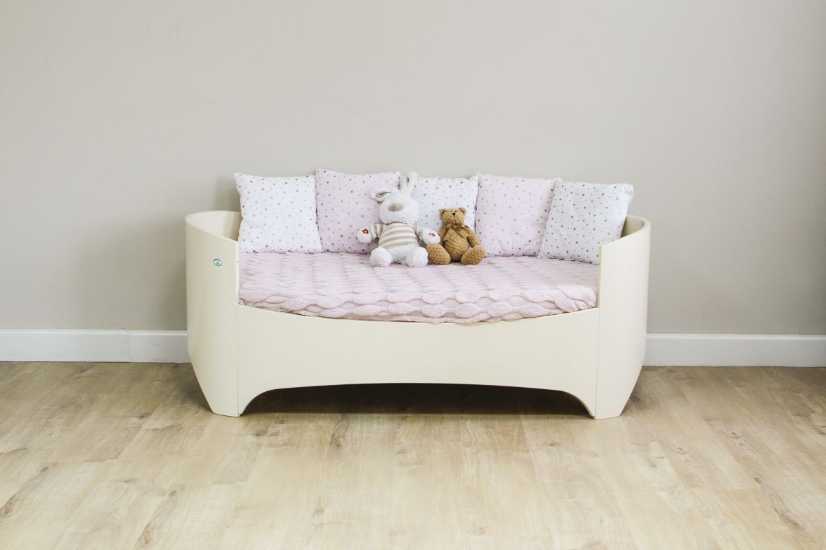 Передний бортик кроватки снимается позволяя использовать кровать как диванчик.