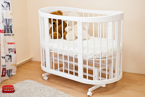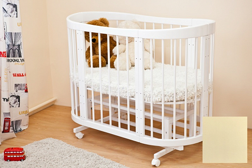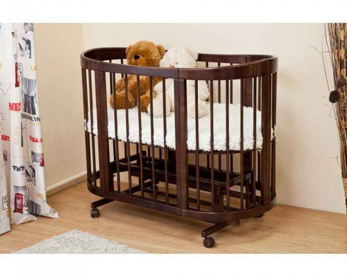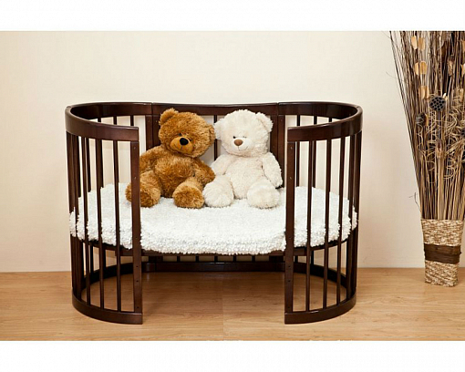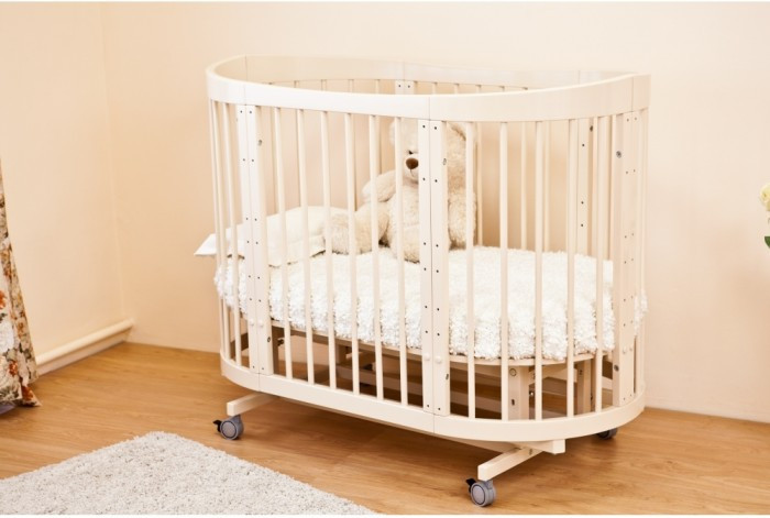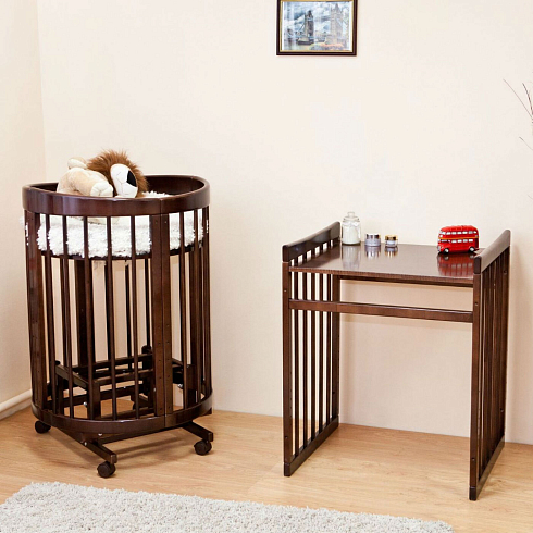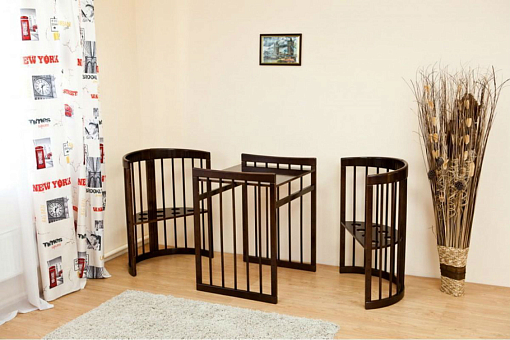 - Кровать трансформируется: круглая колыбель + пеленальный столик, овальная кровать, диванчик, манеж, столик и два кресла.