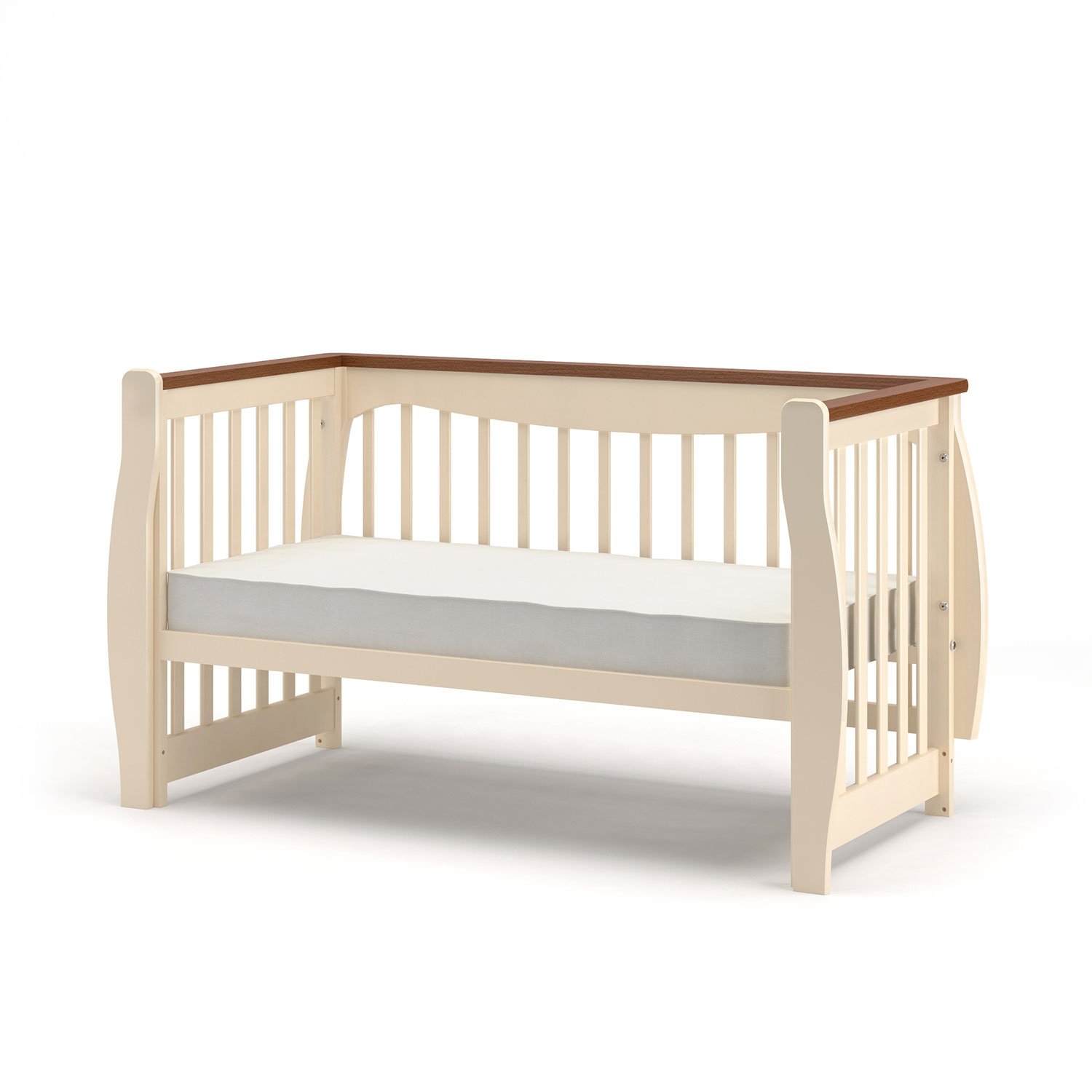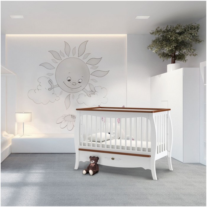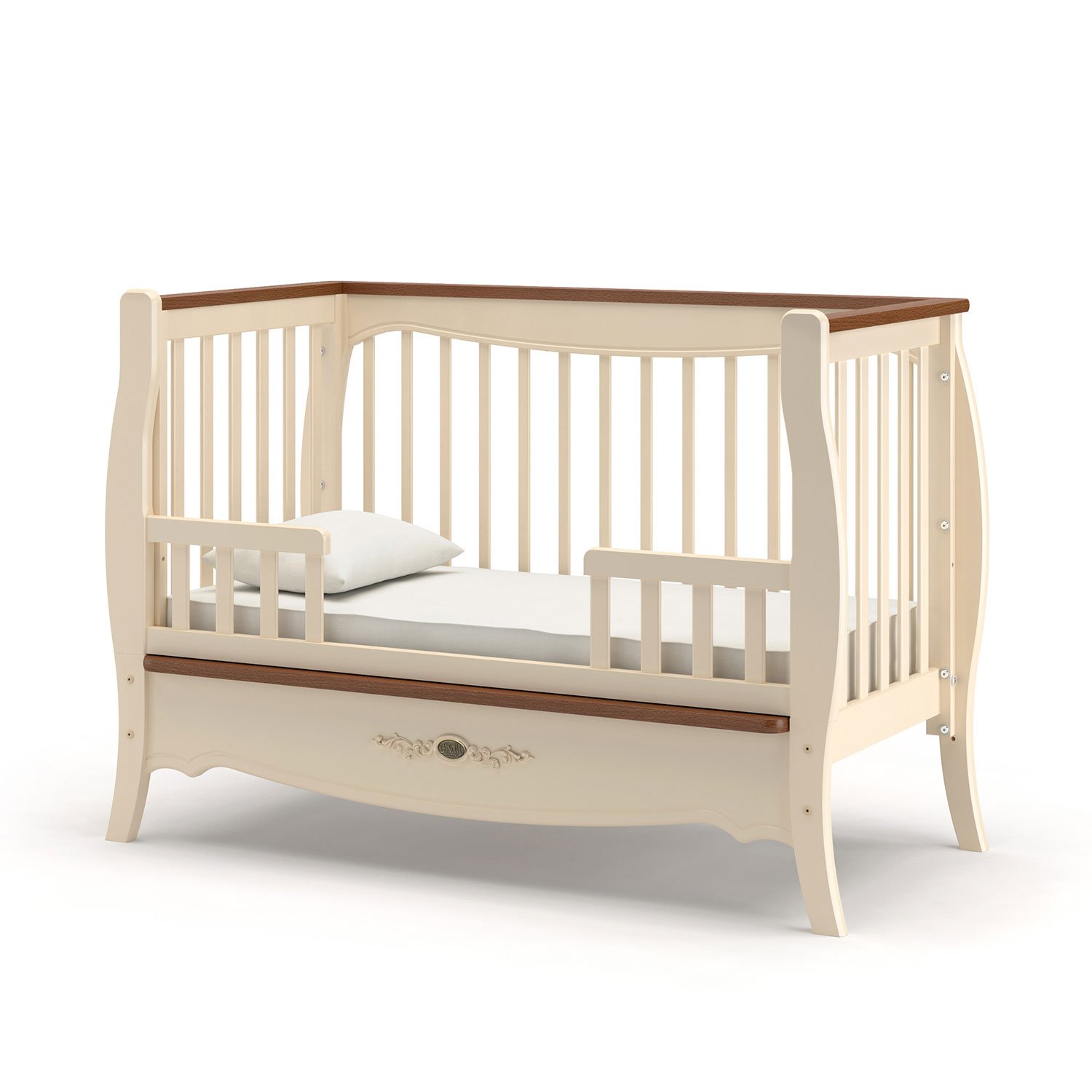 Еще одна очень важная особенность заключается в том, что вы можете одновременно собрать большую кровать (со спальным местом 180х125см) и уютный диванчик. Тем самым получая возможность одновременно использовать сразу две трансформации. Кроватка выполнена в стиле, напоминающем о традициях итальянского барокко: с изогнутыми стойками, элегантными перекладинами и замысловатыми виньетками на нижней части фасада. Материалом служит массив бука. Эмаль, применяемая для защиты от влажности, специально разработана для производства детской мебели. Для покрытия используется безопасный лак, изготовленный на полиуретановый основе.
