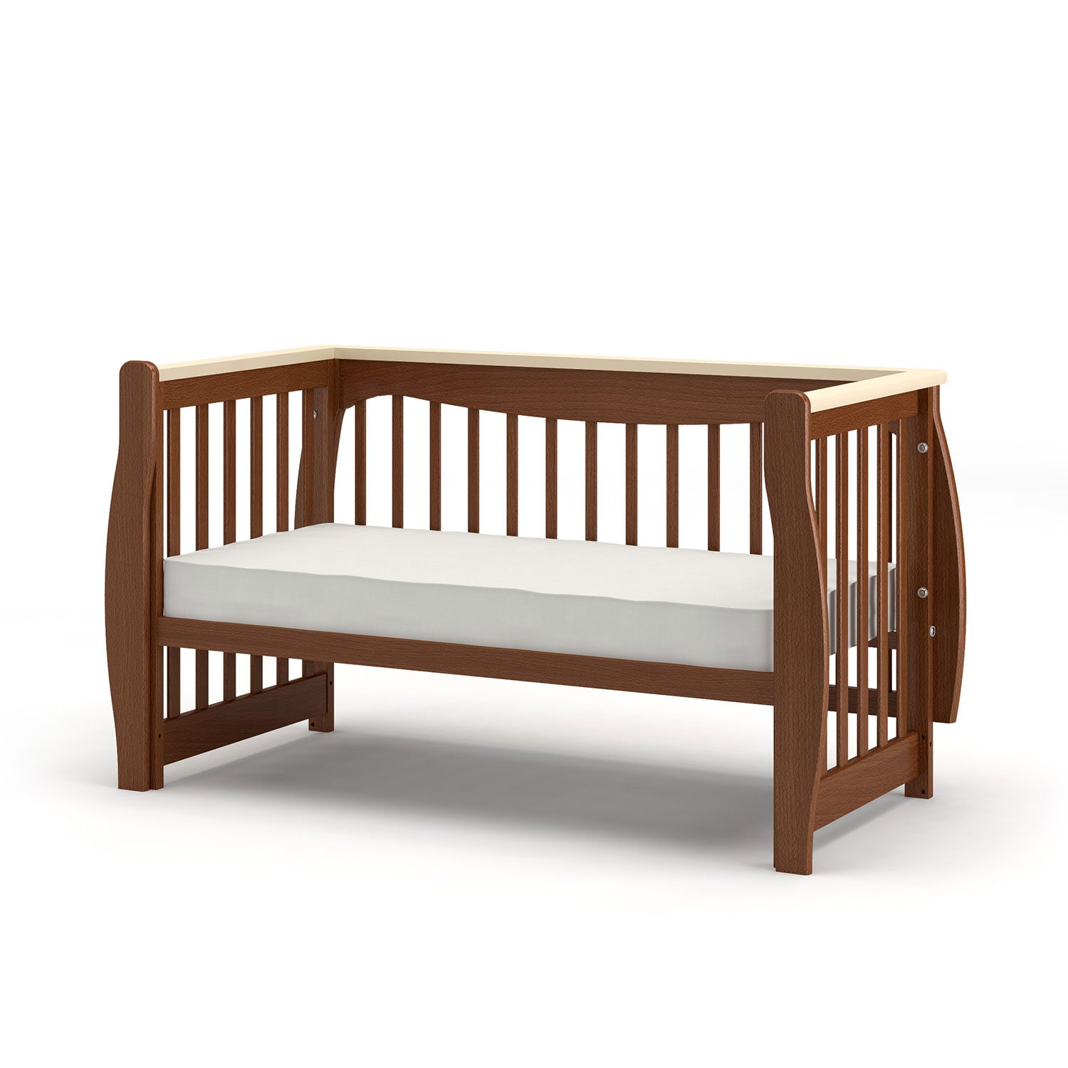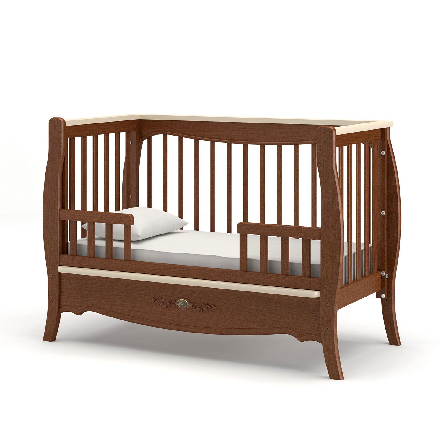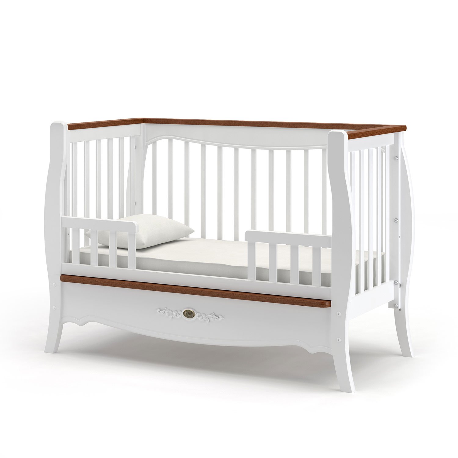 Еще одна очень важная особенность заключается в том, что вы можете одновременно собрать большую кровать (со спальным местом 180х125см) и уютный диванчик. Тем самым получая возможность одновременно использовать сразу две трансформации. Кроватка выполнена в стиле, напоминающем о традициях итальянского барокко: с изогнутыми стойками, элегантными перекладинами и замысловатыми виньетками на нижней части фасада. Материалом служит массив бука. Эмаль, применяемая для защиты от влажности, специально разработана для производства детской мебели. Для покрытия используется безопасный лак, изготовленный на полиуретановый основе.