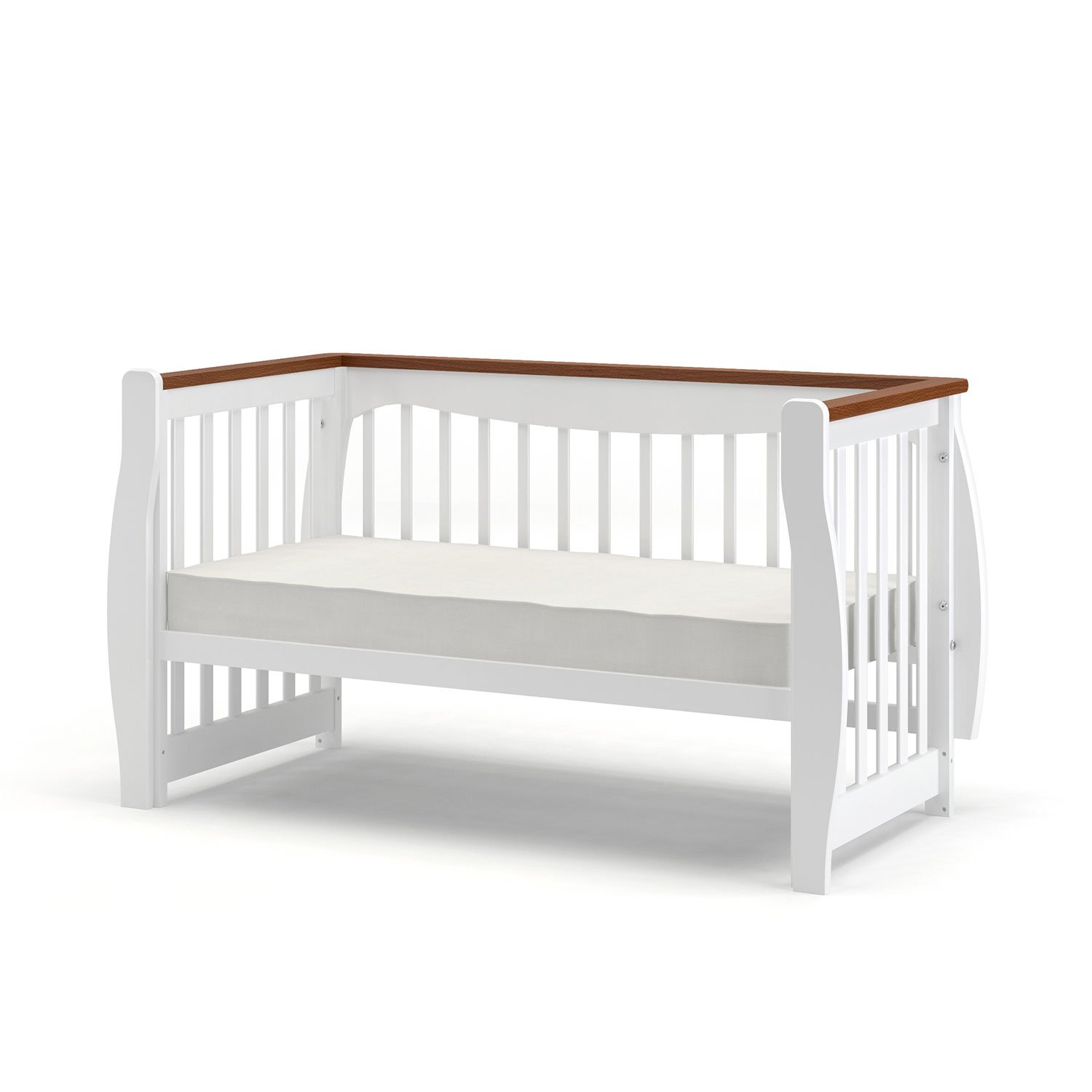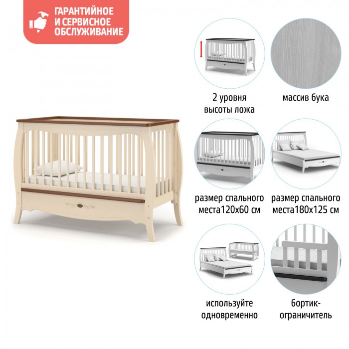 Уникальность данной модели в том, что благодаря продуманной конструкции она способна прослужить своим владельцам не один десяток лет. Используемый материал — кроватка сделана из массива бука, традиционно применяемого для изготовления мебели премиум-класса — гарантирует длительное сохранение идеального состояния.
