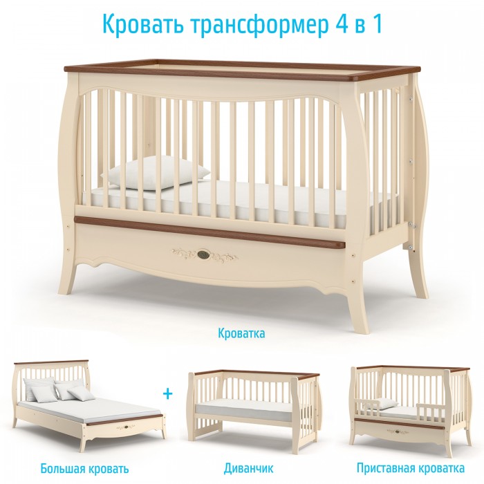 - Варианты трансформации: кровать для новорожденного, диванчик для новорожденного с двумя маленькими бортиками вместо большой передней стенки, приставная кровать, большая кровать. При этом возможно использовать сразу приставную кроватку и большую кровать.