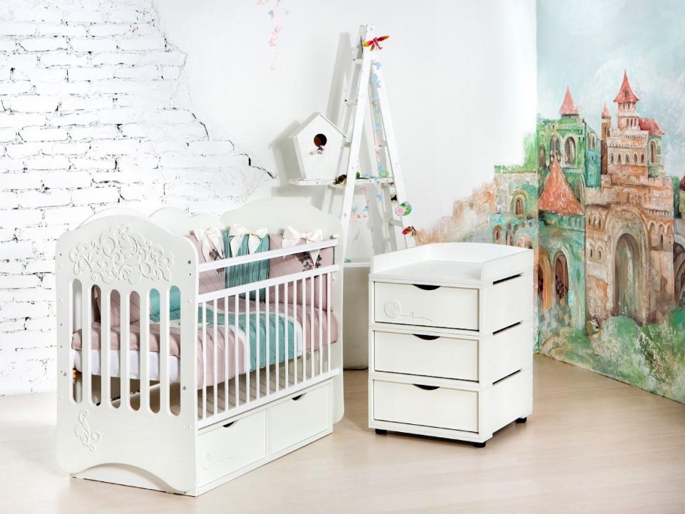 Для новорожденного ребенка Эльф Виола будет комфортной кроваткой 120*60 см с необходимой регулировкой высоты матрасика, с маятником и опускающейся планкой. Под кроваткой будет размещен большой ящик для вещей. Так же в комплект сразу входит комод с 3 ящиками и удобной пеленальный поверхностью.