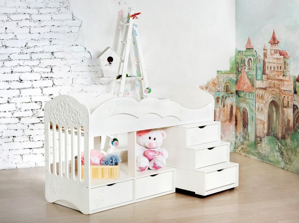 Для ребенка примерно от 3 лет, кровать и комод легко трансформируется в просторную кровать-чердак со спальным местом 170х60 см. Под кроваткой (на первом уровне) будет удобное игровое место с ящиками и полочками. А комод превратиться в удобную лестницу на второй уровень.