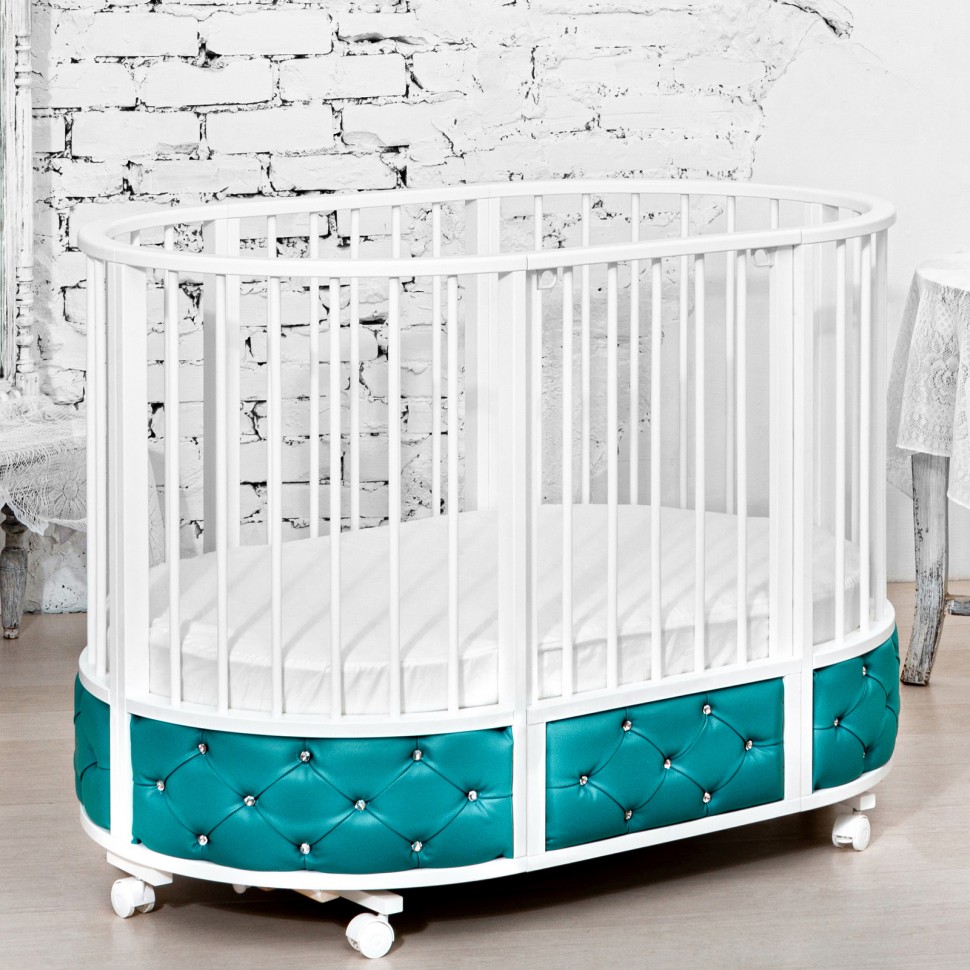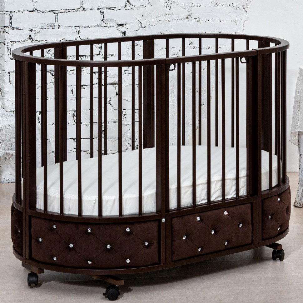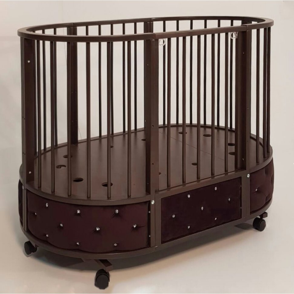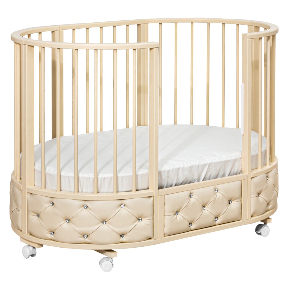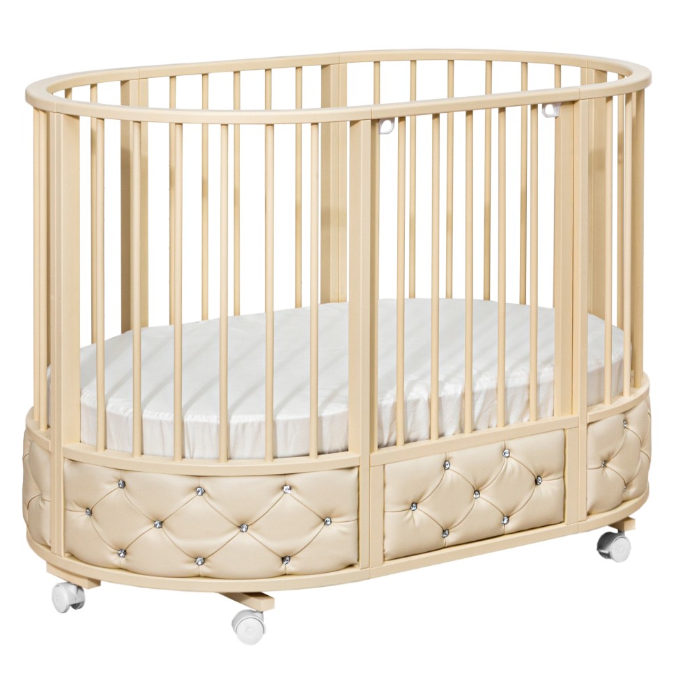 Кровать EVA декор VIP украшена эко кожей или велюром в зависимости от расцветки, каретной стежкой и стразами. Такая кроватка смотрится очень эффектно и дорого.