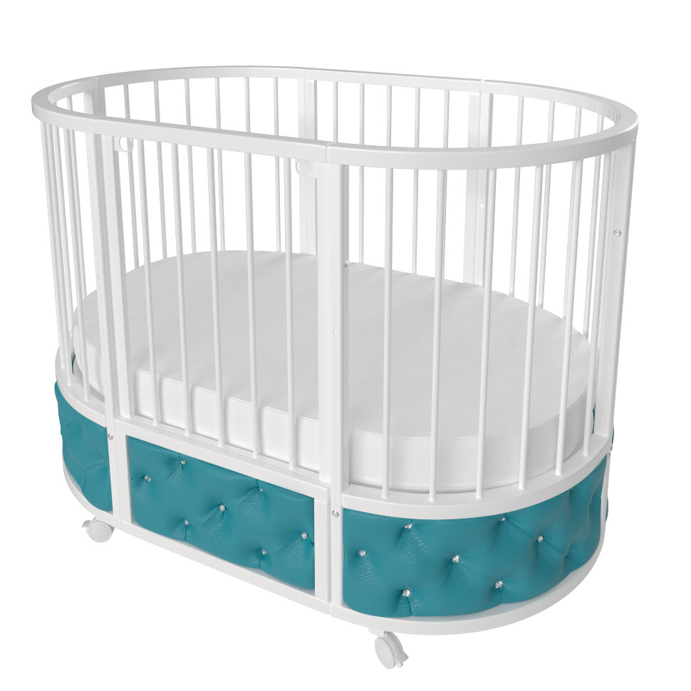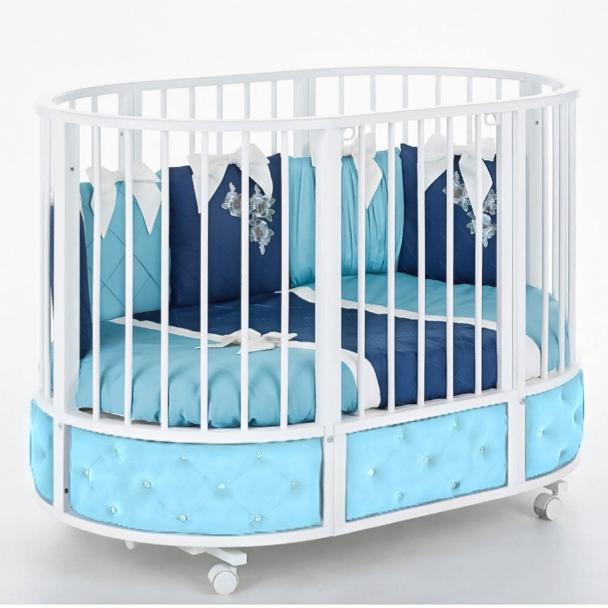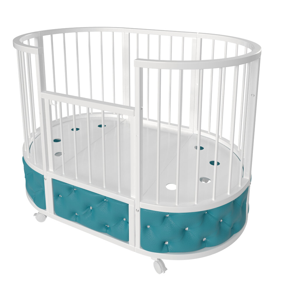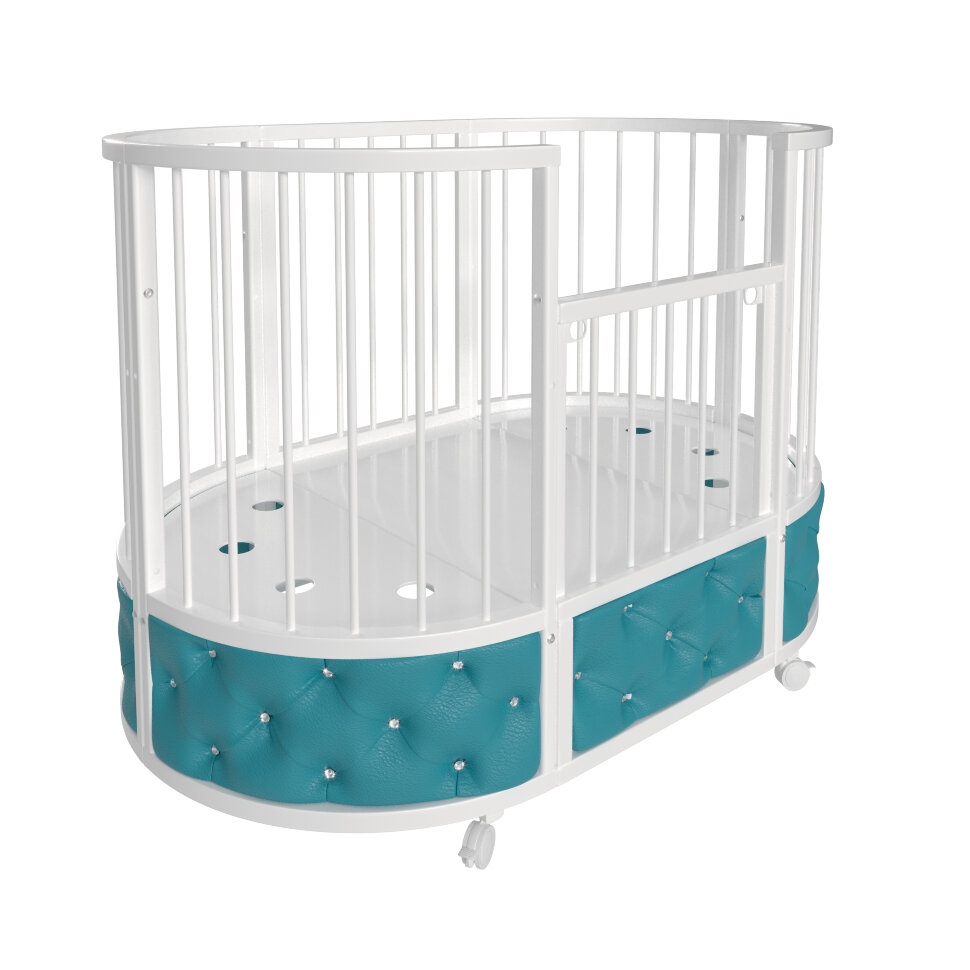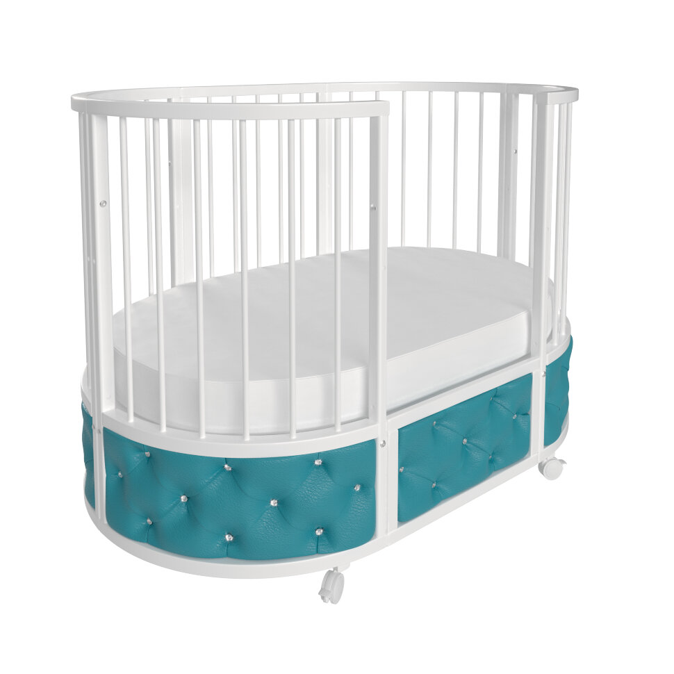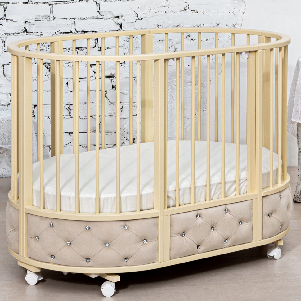Кровать EVA декор VIP украшена эко кожей или велюром в зависимости от расцветки, каретной стежкой и стразами. Такая кроватка смотрится очень эффектно и дорого.