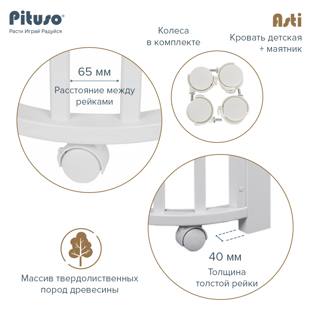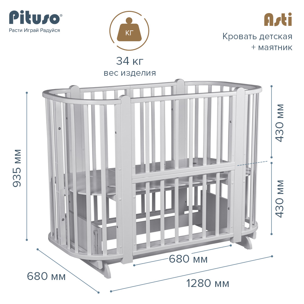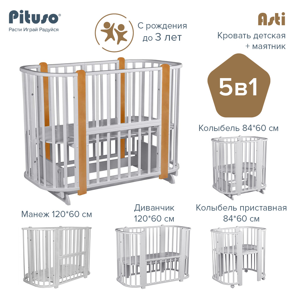 Кровать -трансформер Pituso Asti 5 в 1 (Питусо асти) - детская кровать с возможностью подстраиваться под возраст ребенка и требованиям родителей. Всего одна кровать, но большое количество вариантов ее использования. Для ребенка с рождения Pituso Asti станет комфортной и уютной колыбелькой. Когда ребенок подрастет модель трансформируется в кроватку больших размеров. Если ребенок ночью кушает или плохо спит без родителей, то модель легко трансформировать в приставную кроватку (когда кроватка с ребенком стоит вплотную к родительской кровати, а у мамы легкий доступ к малышу). Нужно безопасное место для игр пока родители занимаются делами - опустите дно кроватки на самый нижний уровень и у вас получится безопасный деревянный манеж. Когда ребенок захочет самостоятельно залазить в кроватку и спать "как большой" кроватка превратиться в удобный диванчик.