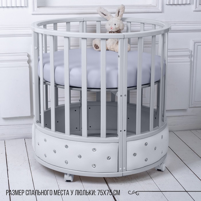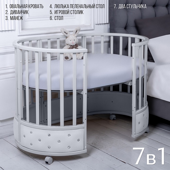 Модель адаптируется под растущего ребенка и имеет шесть вариантов трансформации: круглая кровать, овальная кровать, манеж, два стульчика, столик, диванчик