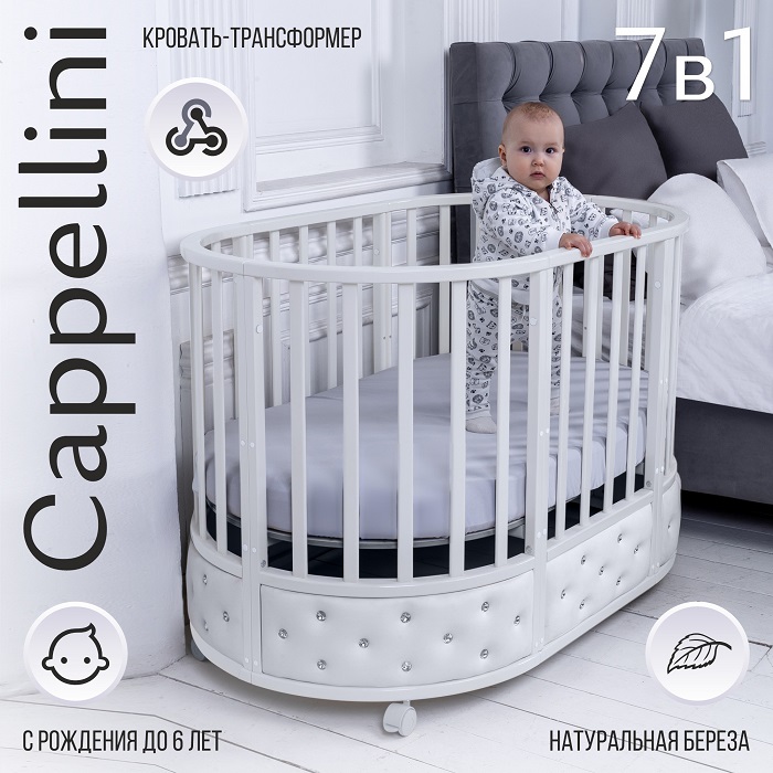 Кровать трансформер Sweet Baby Cappellini 7 в 1 (Свит беби)- изысканная кроватка для ребенка с рождения до 6 лет с мягкими вставками из эко кожи и стразами. Модель сочетает в себе роскошный дизайн, широкий набор функций и отличное качество.