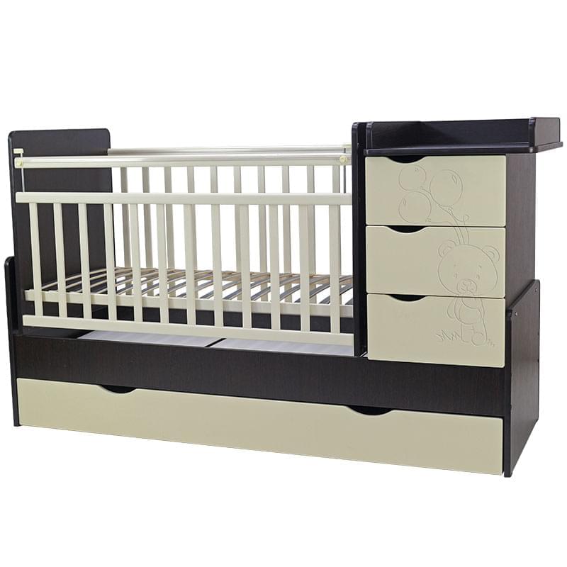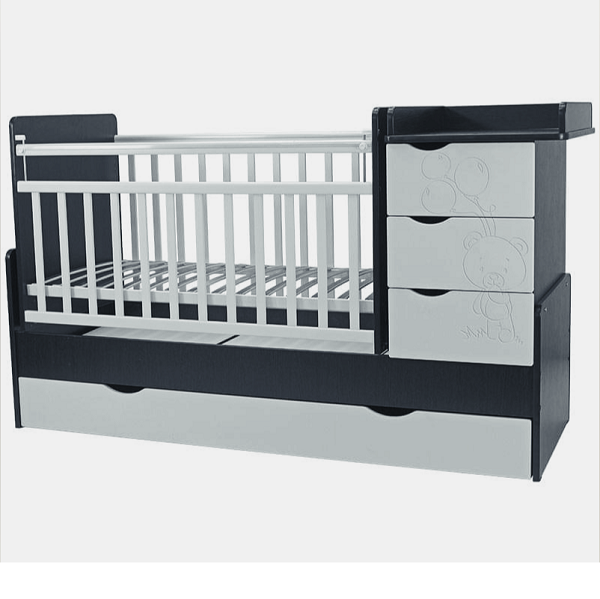 - кроватка сочетает в себе: спальное ложе, комодик на колесиках, пеленальный столик, дополнительное место для хранения под ложем