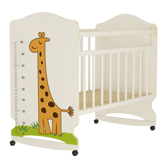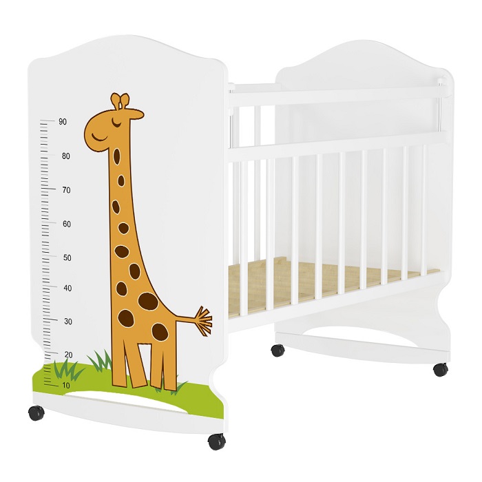 Светлая кроватка с замечательными рисунками животных и ростомером привлекательна своей функциональностью и простотой одновременно.