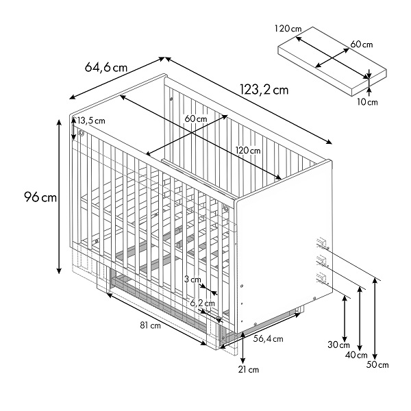 - Габариты кроватки (ДхШхВ) – 123,2х64,6х96 см.