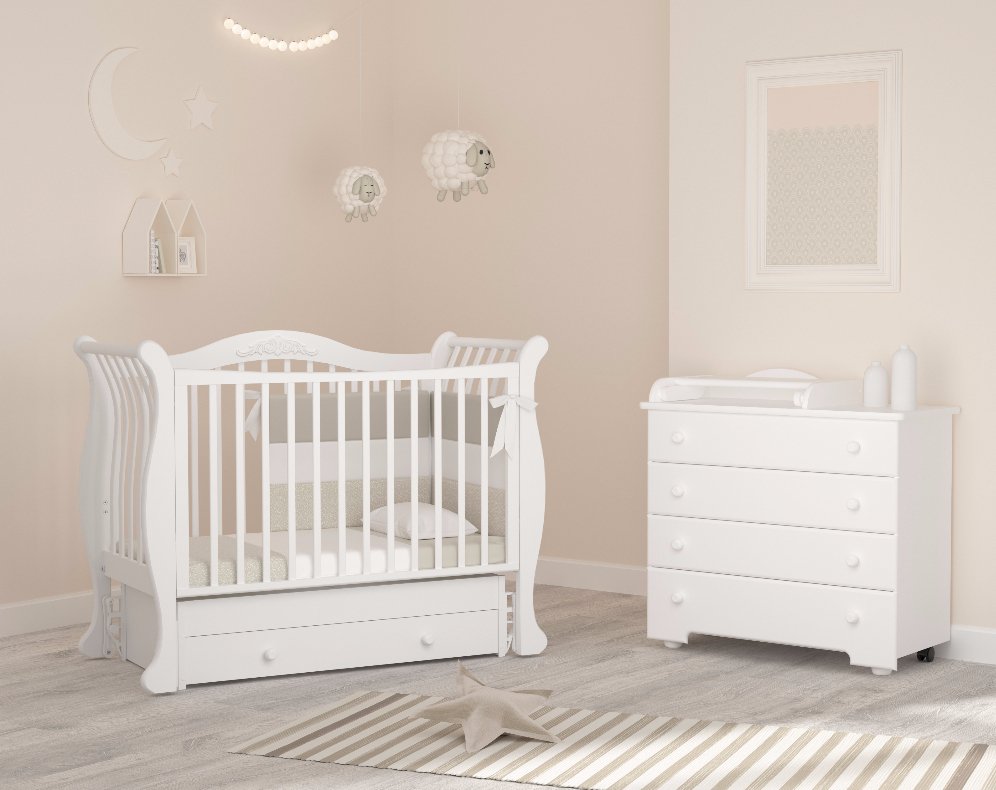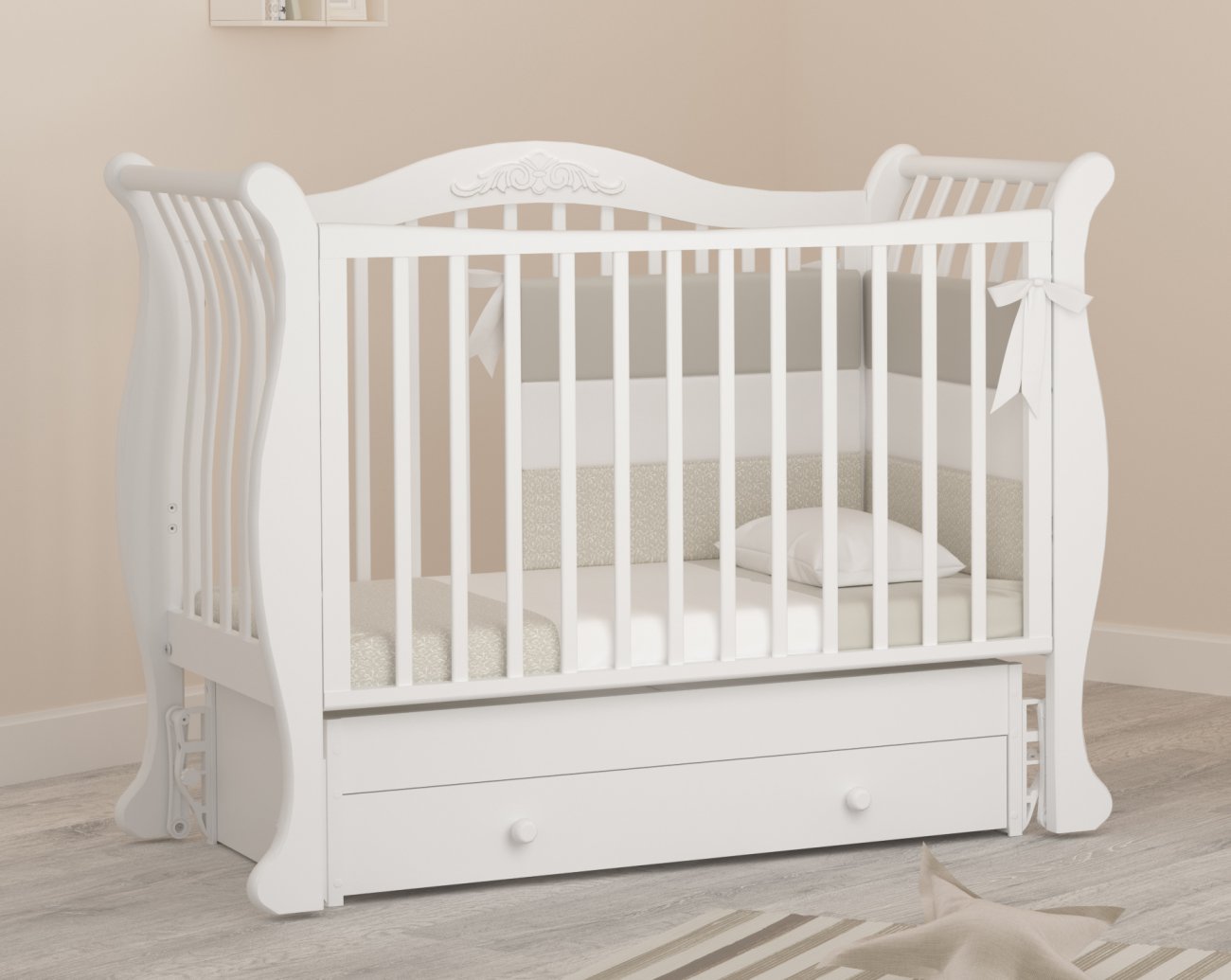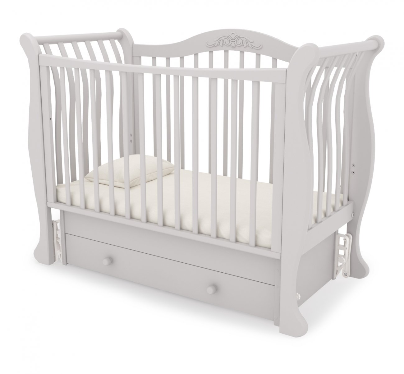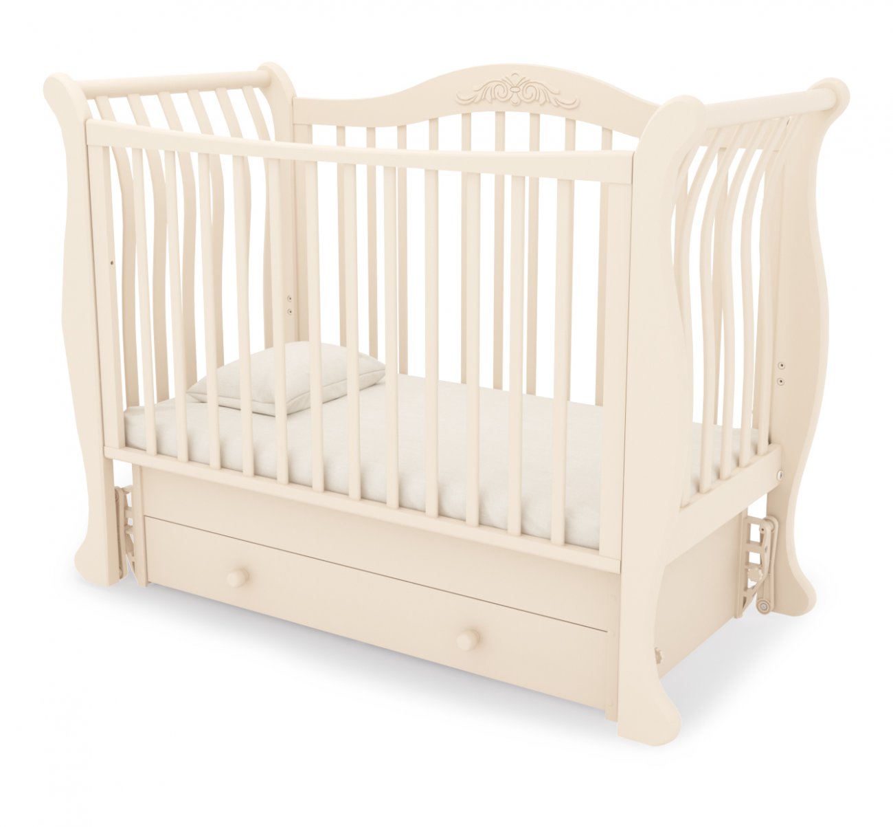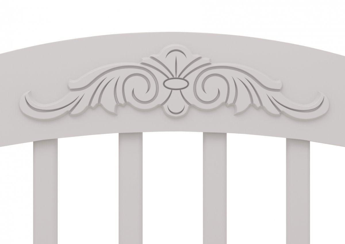 Изысканная роскошь этого ложа для новорожденного ребенка, созданная конструкторами при помощи изогнутых боковин с украшением изящной резьбой и гармоничного противовеса узких и широких деталей, способна украсить собой любой интерьер современной детской комнаты.