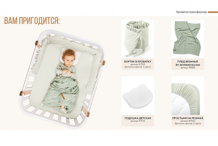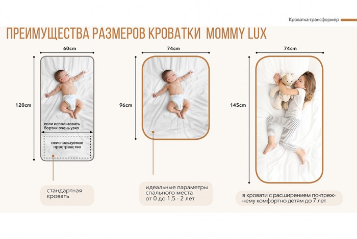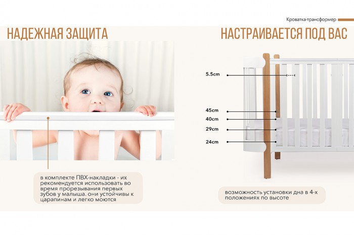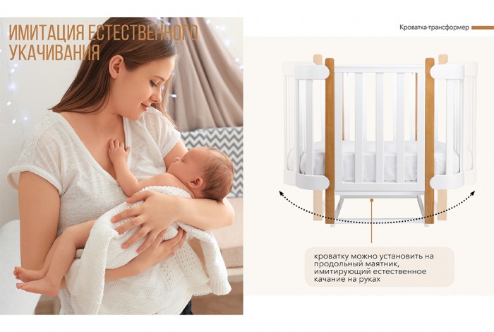 Варианты трансформации: люлька 96х74см, большая кроватка 145х74 см, диванчик 145х74 см, прикроватная модель.