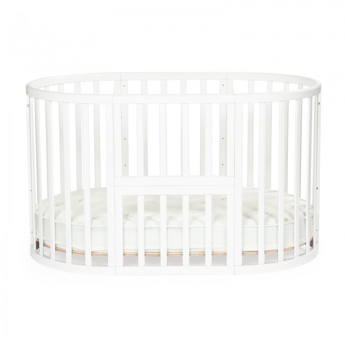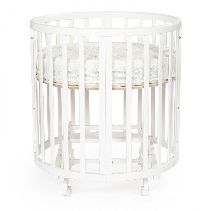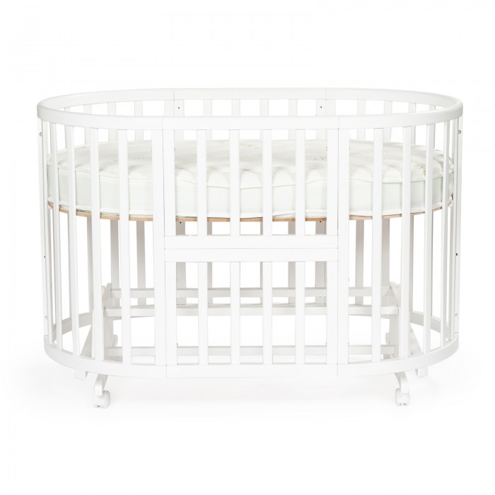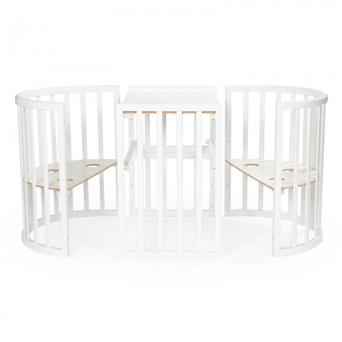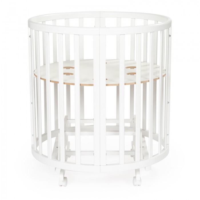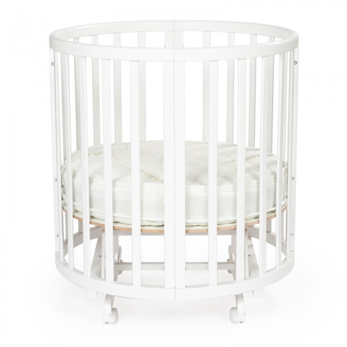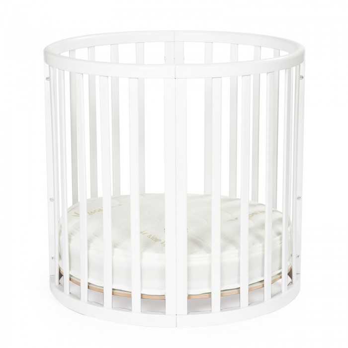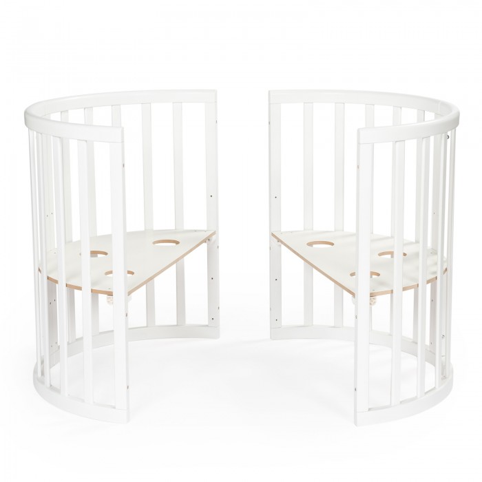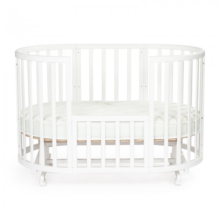 Кроватка легко трансформируется с круглой колыбели в овальную кроватку. Если полностью опустить спальное ложе, получится удобный деревянный манеж. Если в овальной модели снять передний бортик кроватка станет диванчиком или приставной кроваткой к взрослой. После 4-5 лет, когда ребенок вырастит из кроватки, ее можно превратить в столик - парту и два кресла для игр и занятий.