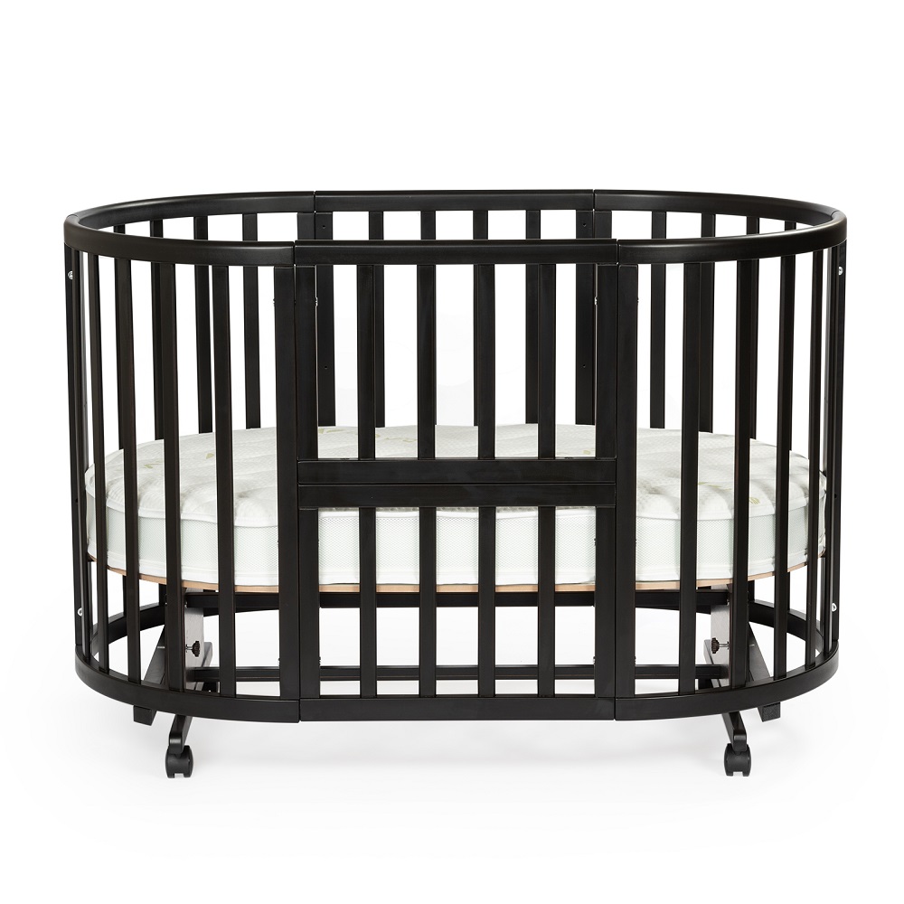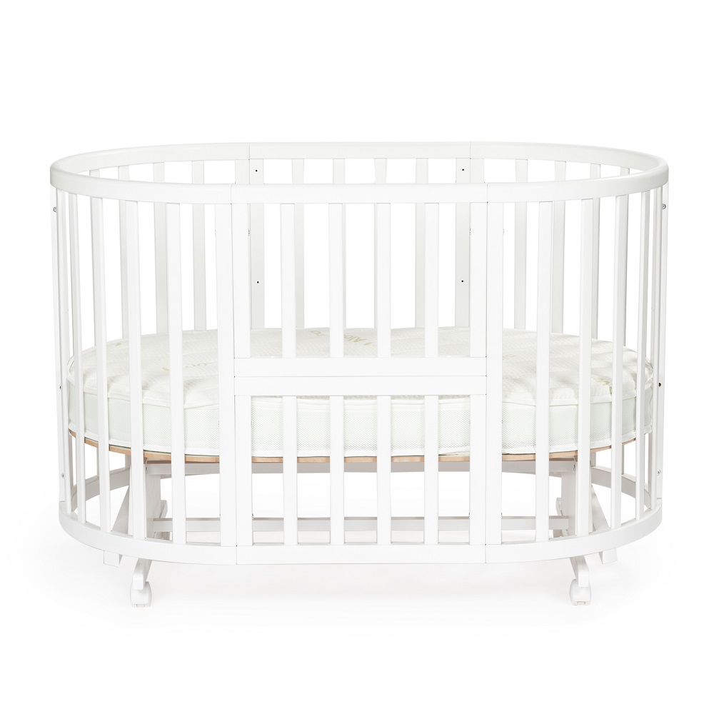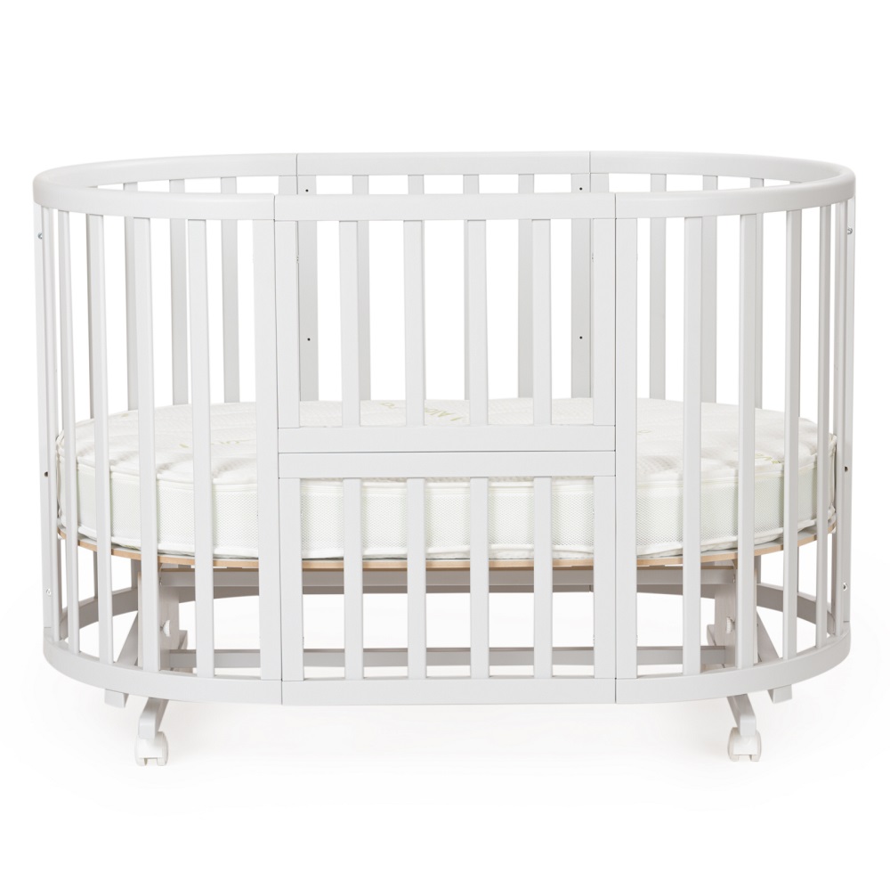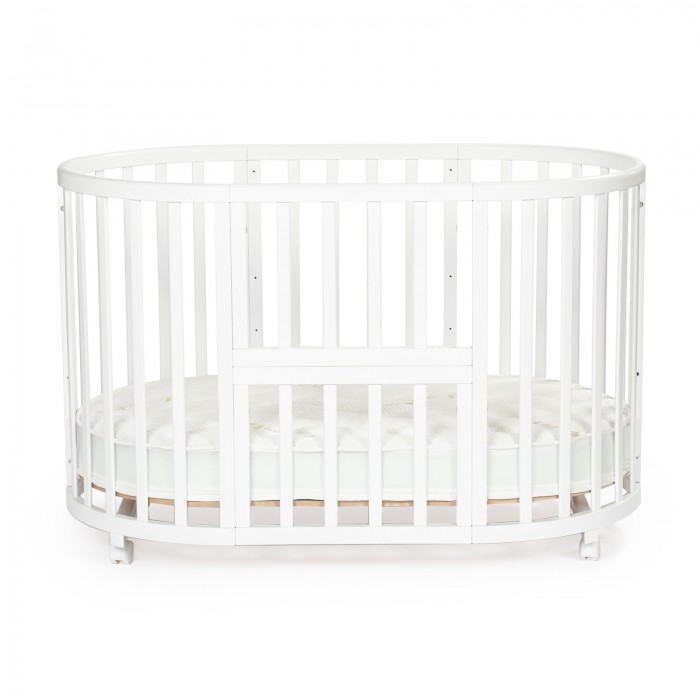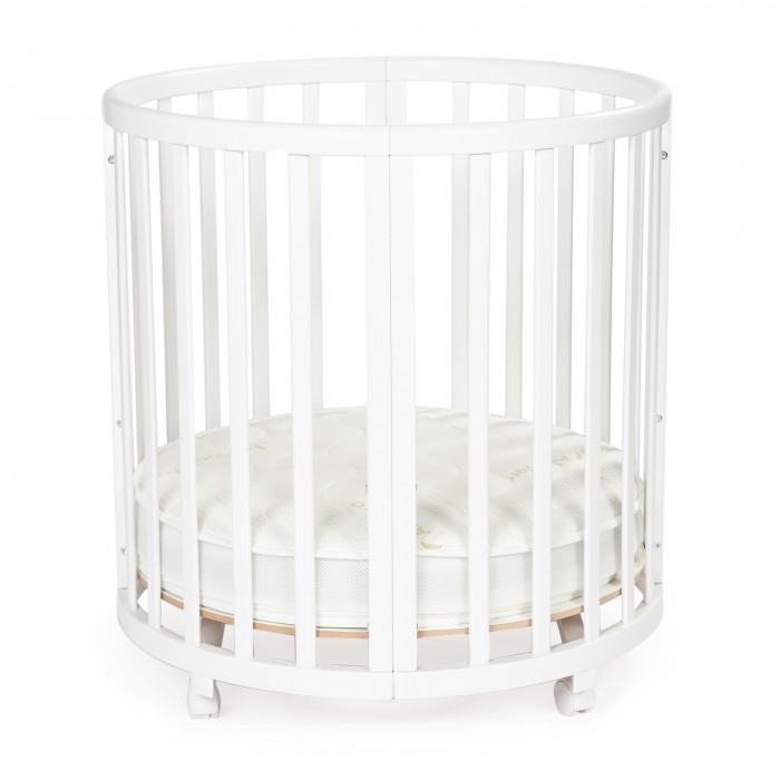 Кроватка легко трансформируется с круглой колыбели в овальную кроватку. Если полностью опустить спальное ложе, получится удобный деревянный манеж. Если в овальной модели снять передний бортик кроватка станет диванчиком или приставной кроваткой к взрослой. После 4-5 лет, когда ребенок вырастит из кроватки, ее можно превратить в столик - парту и два кресла для игр и занятий.