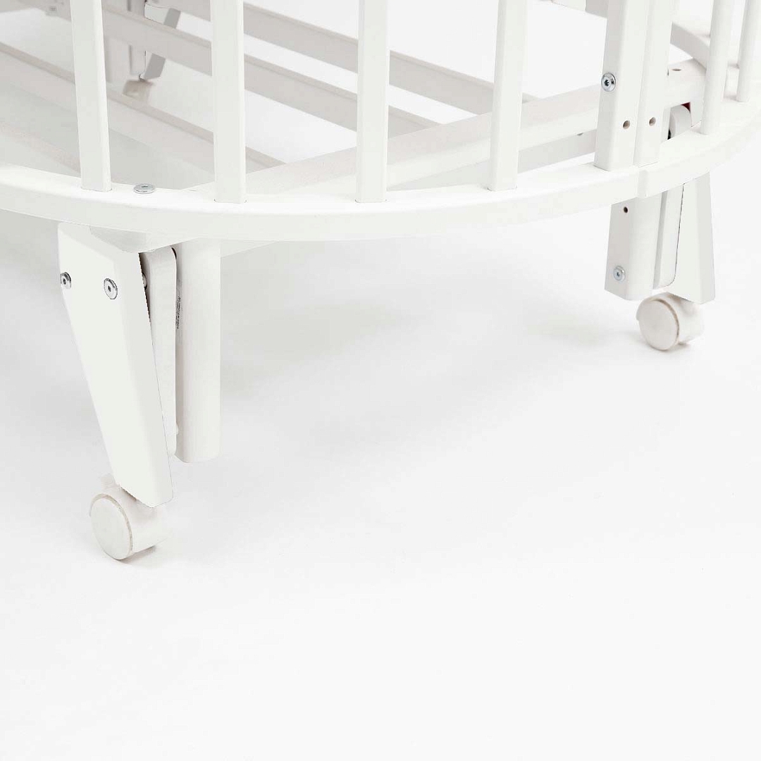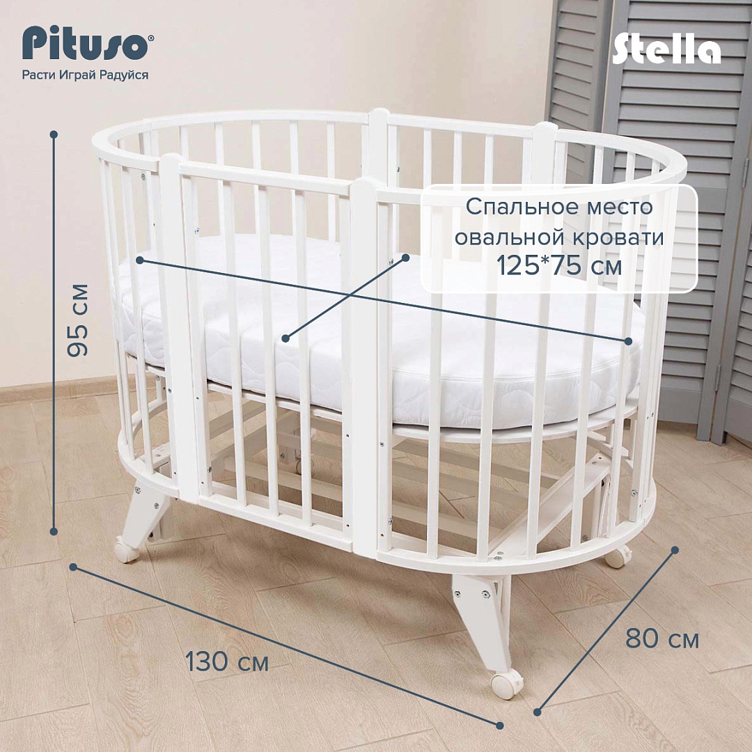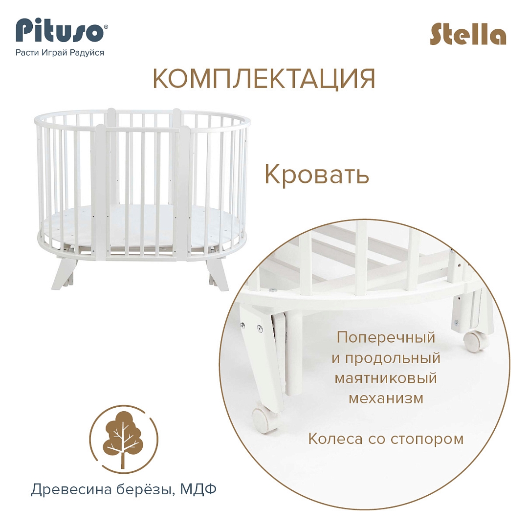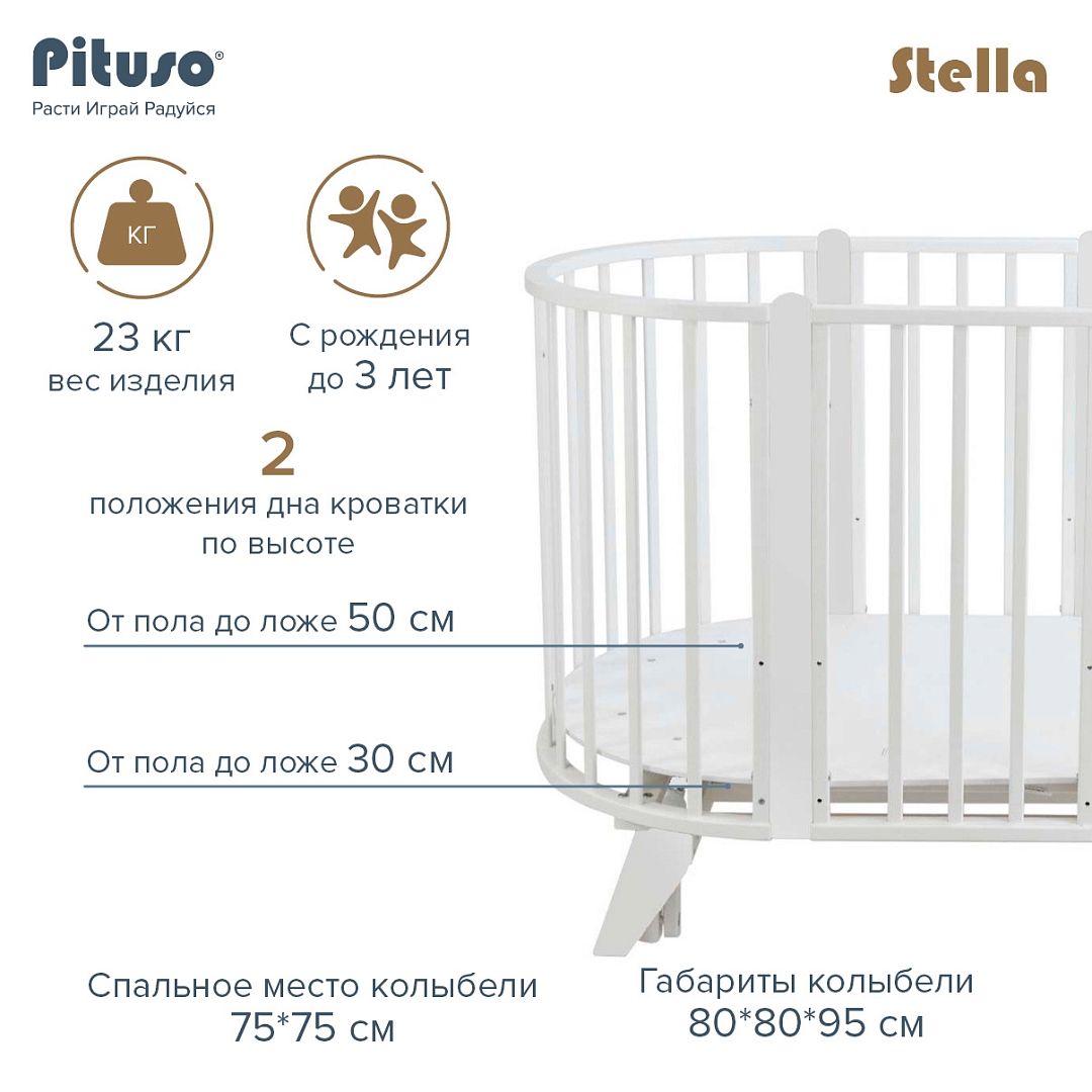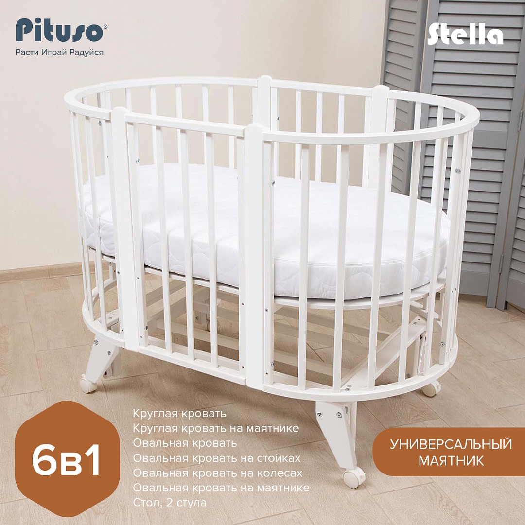 Круглая кровать PITUSO Stella (Питусо стелла) - красивая кроватка-трансформер, которая в зависимости от возраста ребенка может менять размеры спального места и свой функционал. Оснащена колесами, и универсальным маятником. При необходимости все снимается и кроватка ставится на ножки.