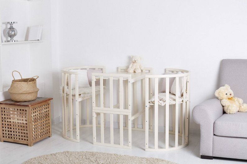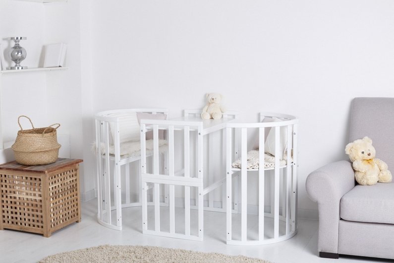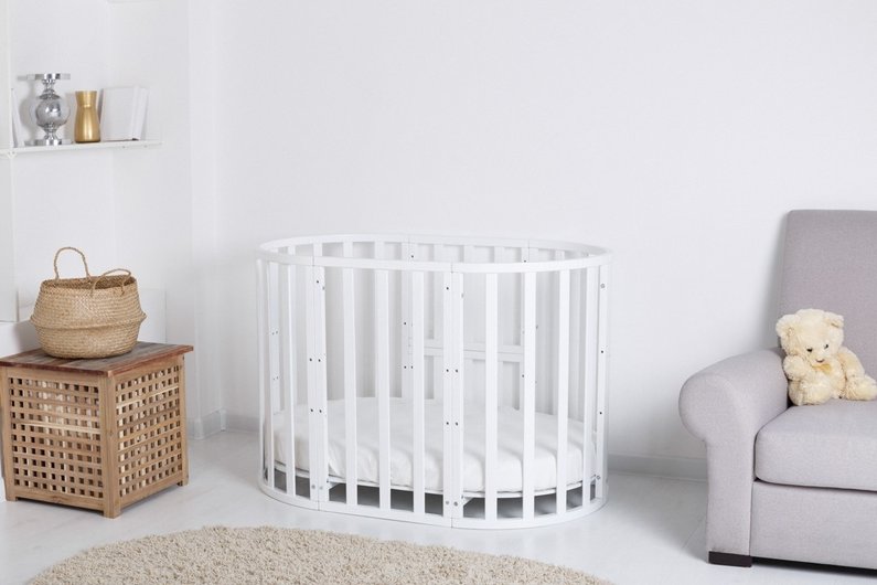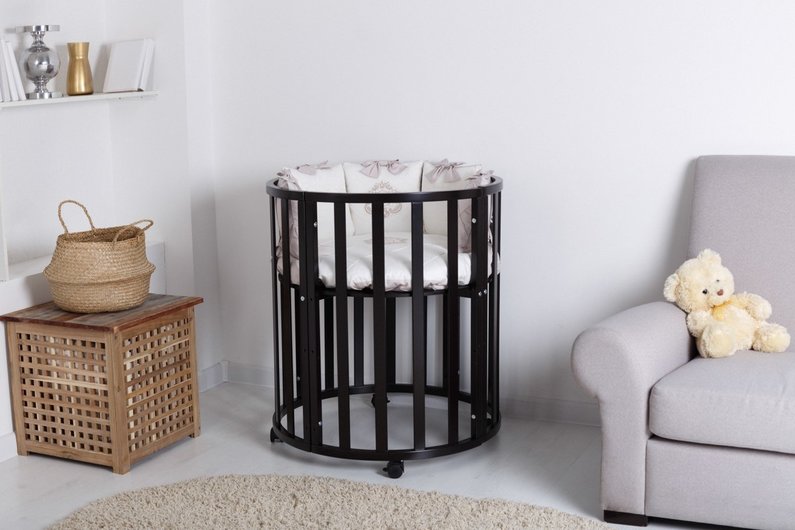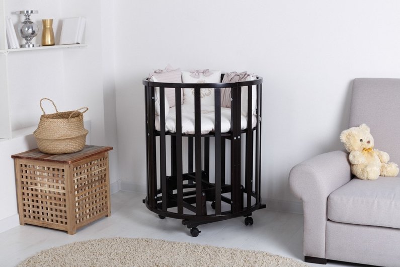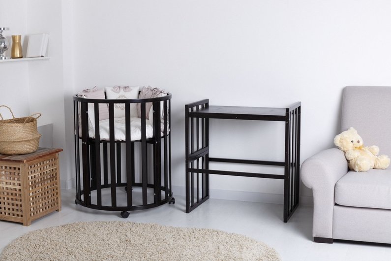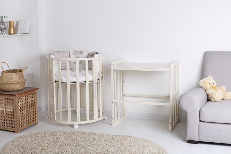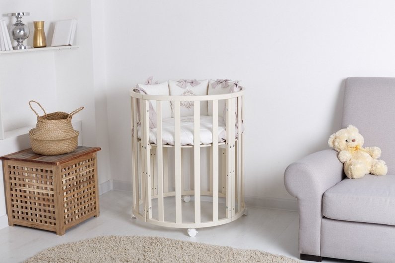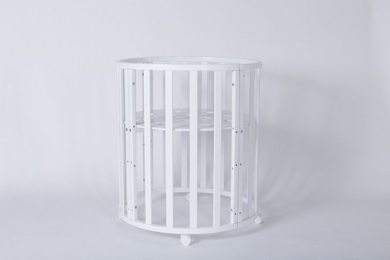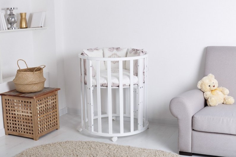 Круглая колыбелька помогает малышу легче адаптироваться к окружающей среде. Создает уютное и небольшое гнездышко для первых месяцев после рождения. В такой кроватке малыш будет чувствовать себя защищено. Одновременно с круглой кроваткой можно собрать пеленальный столик с одной полочкой.