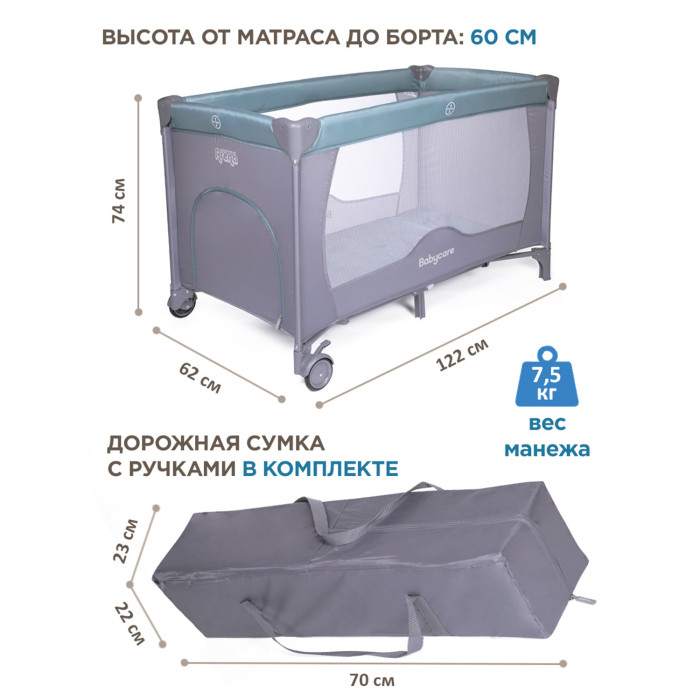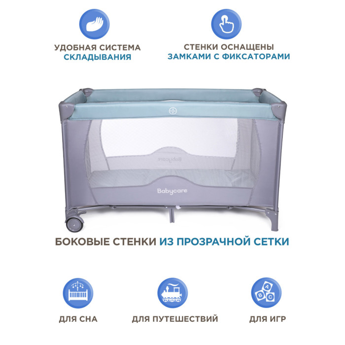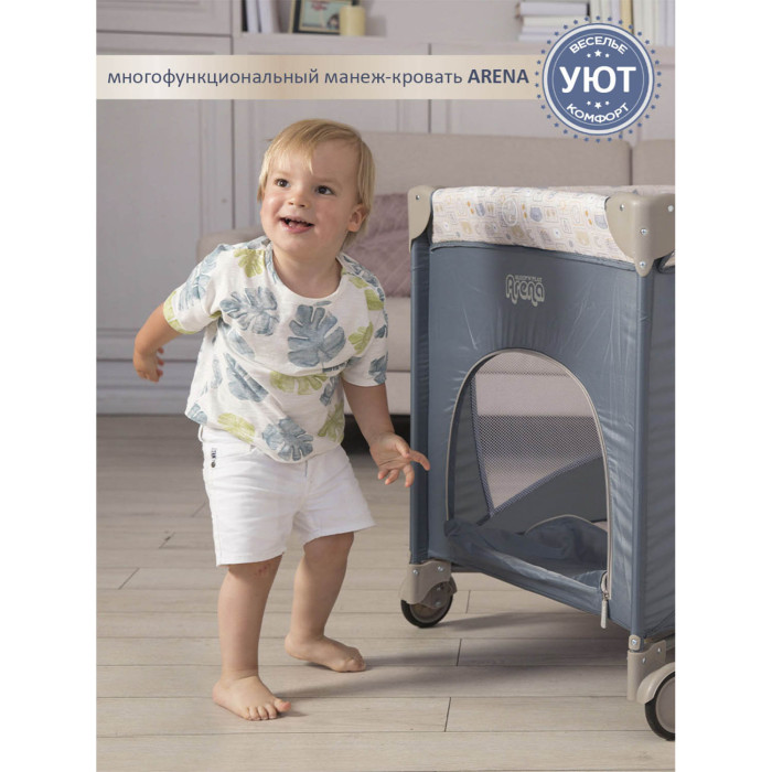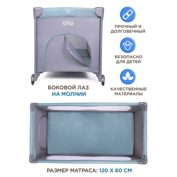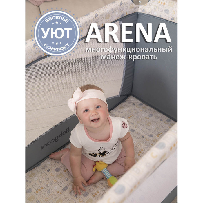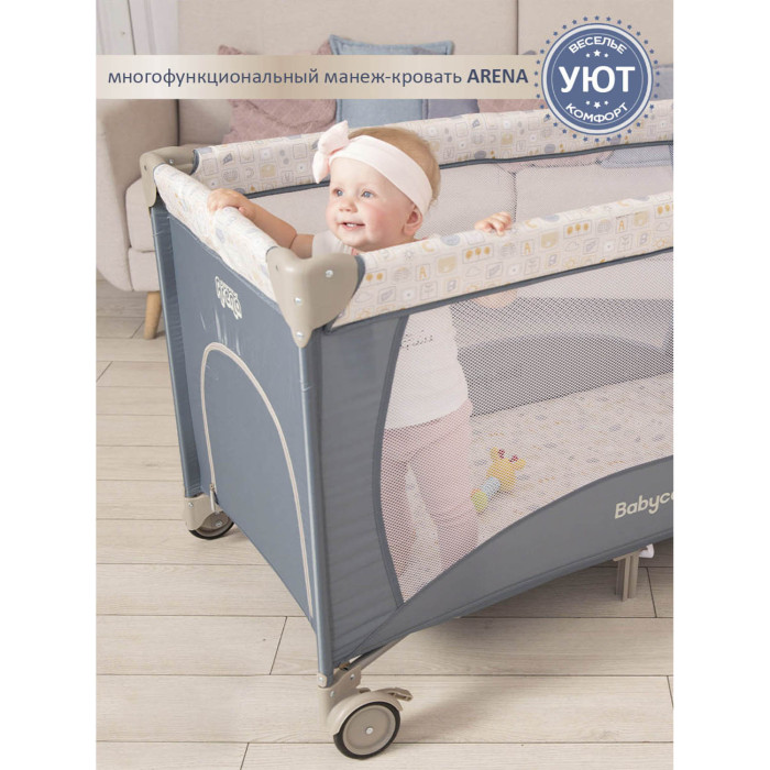 Манеж-кровать BabyCare Arena (бебикеа арена) - безопасный и удобный манеж- кроватка для детей с рождения до 3-х лет. Такая модель может стать полноценной кроваткой, которая обеспечит ребенку безопасной и комфортный сон. В комплект входит мягкий складной матрасик. Такую кроватку удобно брать на природу, в гости, на дачу, или отпуск. Так же эту модель можно использовать как манеж для безопасных игр дома или на свежем воздухе. Сетчатые стенки помогут всегда видеть ребенка и обеспечат хорошую вентиляцию внутри. Для подросших детей есть удобный лаз на молнии. Манеж очень компактно складывается и убирается в специальную сумку-чехол. Он абсолютно безопасен для ребенка, устойчив и выполнен только из качественных материалов.