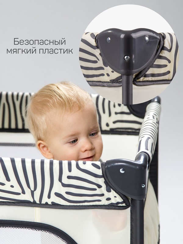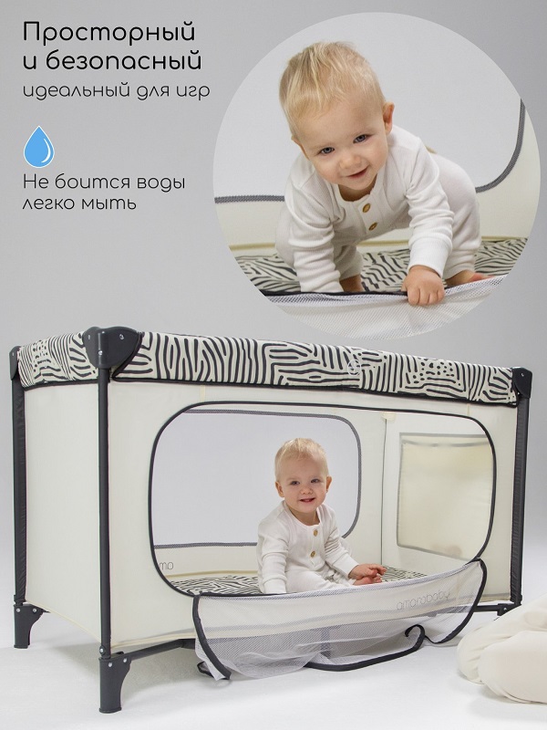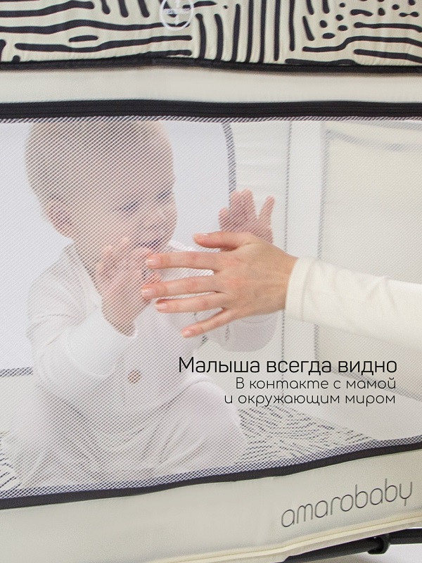 Манеж Amarobaby SMART имеет надежную и устойчивую конструкцию. Все уголки закрыты пластиковыми накладками, а бортики выполнены с мягким уплотнителем. Качественная обивка имеет стильный внешний вид, отличается прочностью и долговечностью, и не боится воды. Два бортика оснащены сетчатым материалом, чтобы вам было лучше видно ребенка, а ему вас.